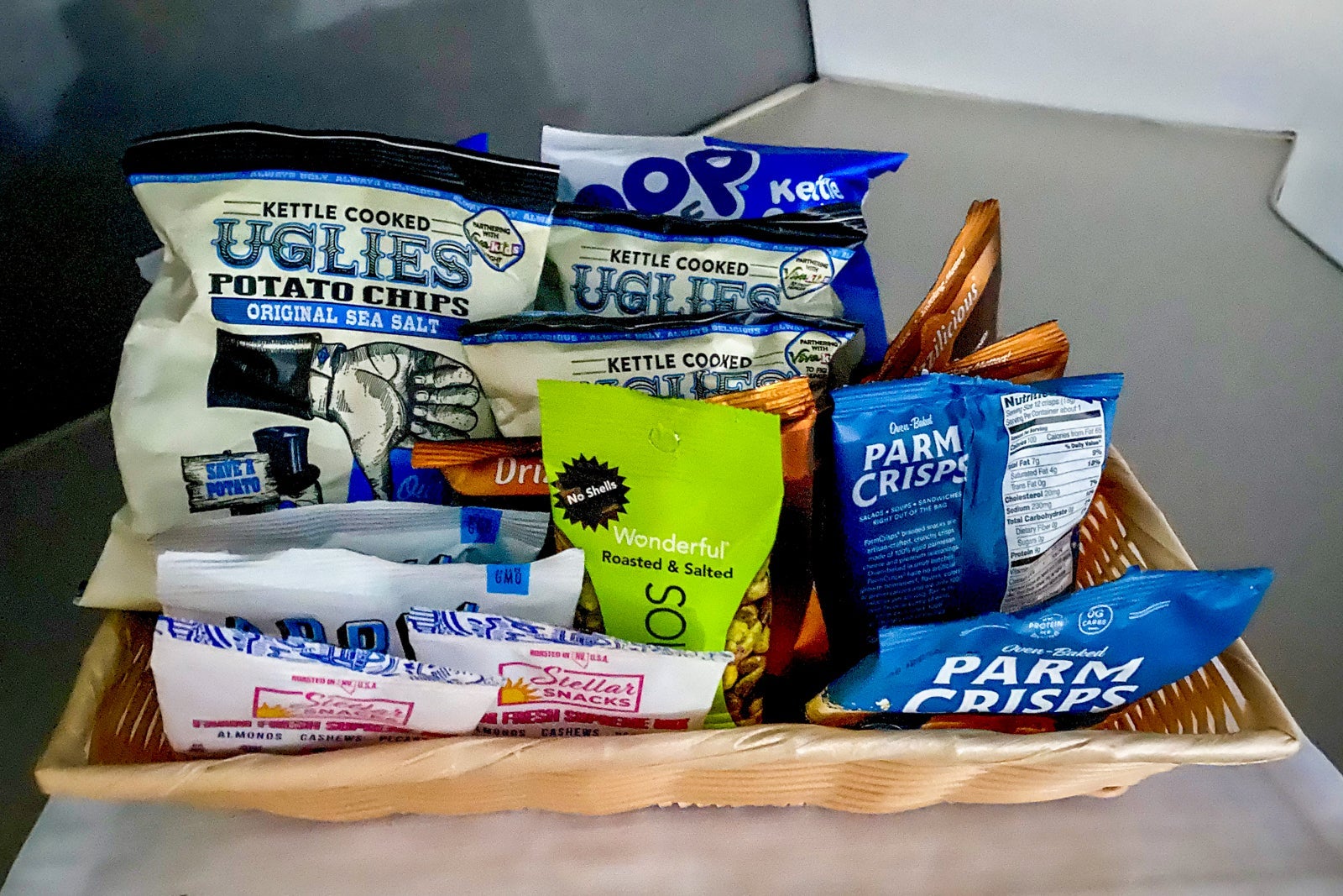 The standard snack basket was available at the front of the first class cabin following the meal service and had a full selection of chips, nuts and more.