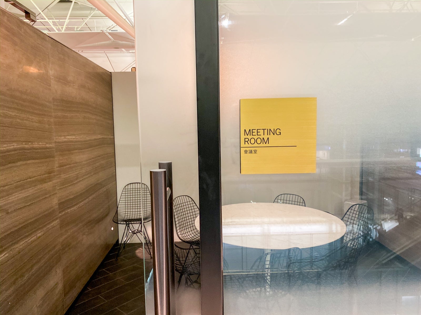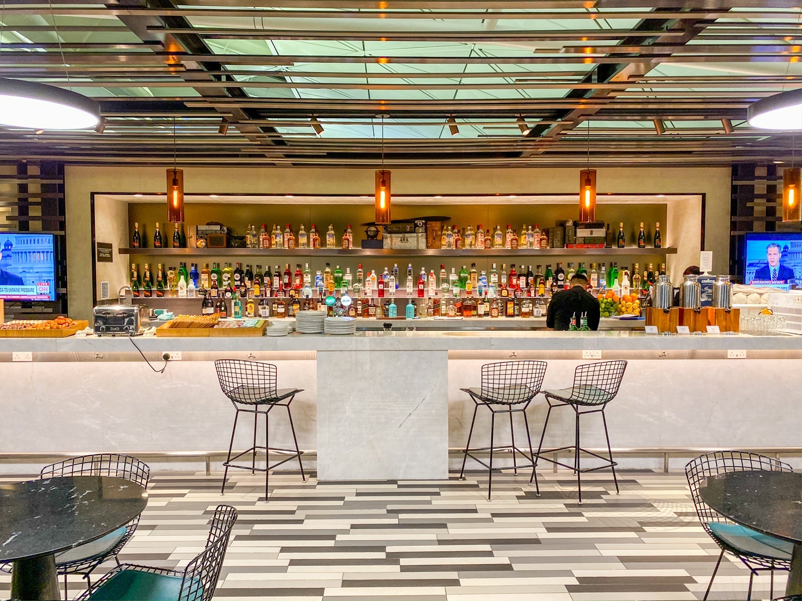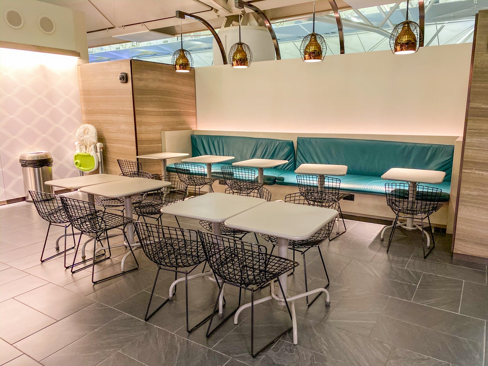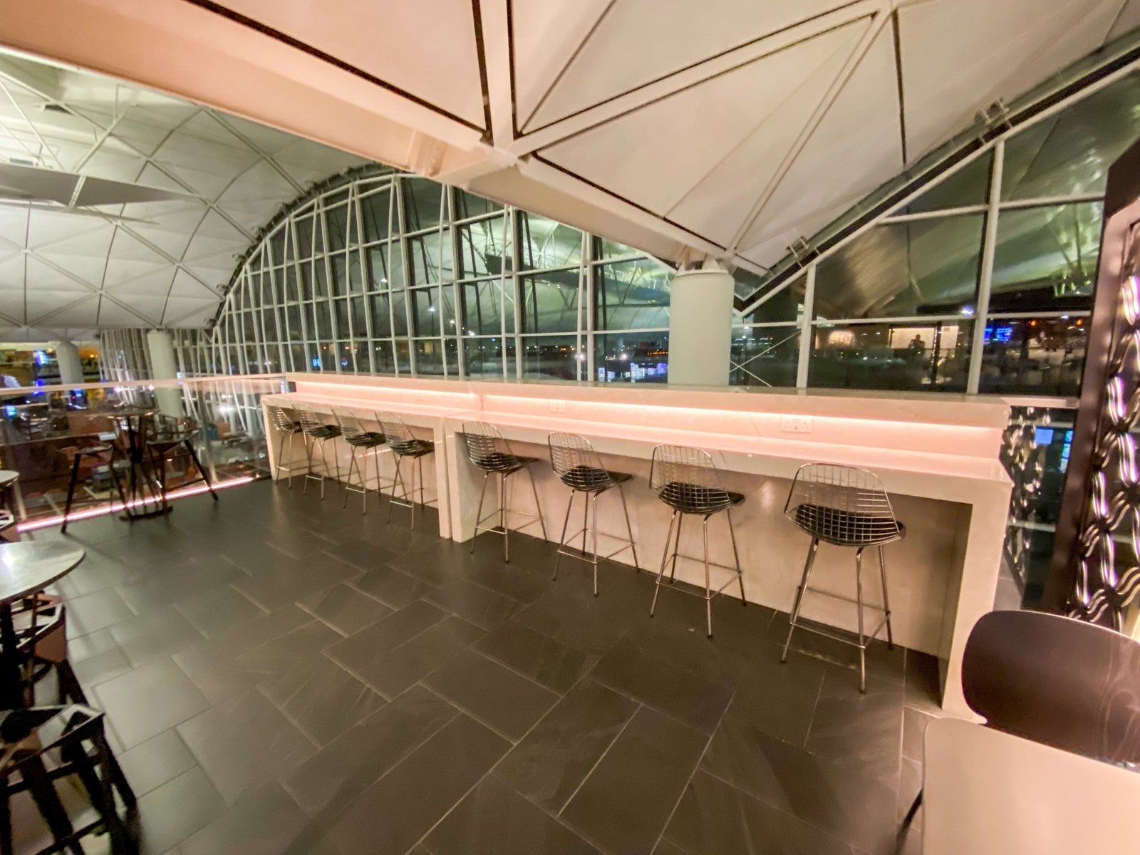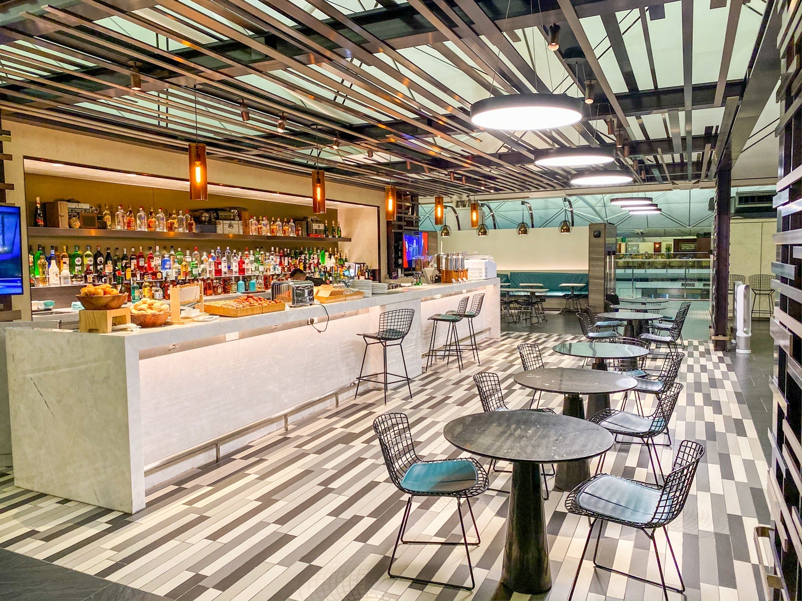 The lounge is open-air, affording great airport views and adding to the space's volume.