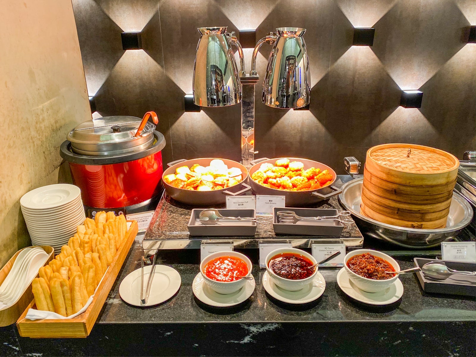 The hot foods included hard boiled eggs, waffles, Asian noodles, sausages, potatoes, scrambled eggs, pork patties and other Asian specialities like dried oysters and shrimp dumplings.