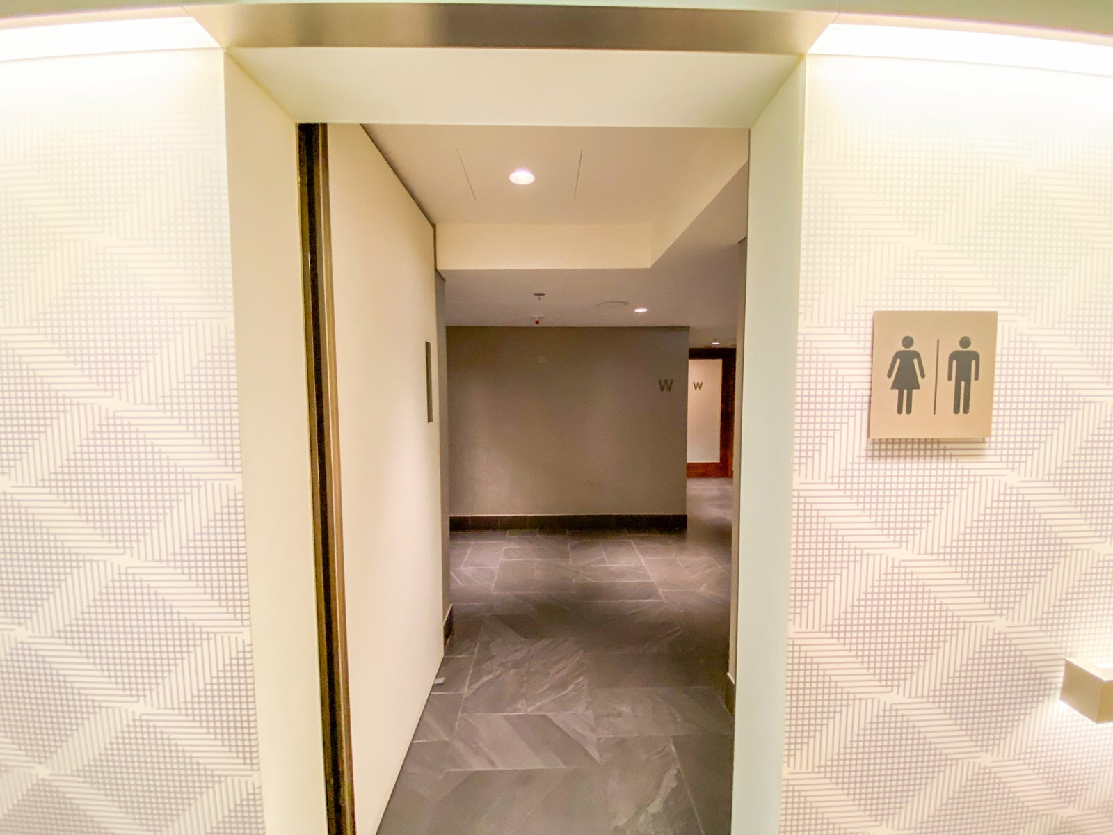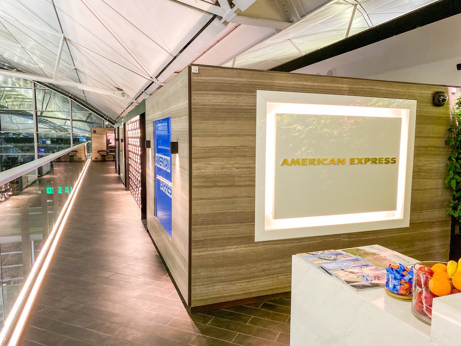 The Centurion Lounge in Hong Kong is L-shaped, with a long corridor extending beyond the entrance before making a sharp turn and getting into the main relaxation area.