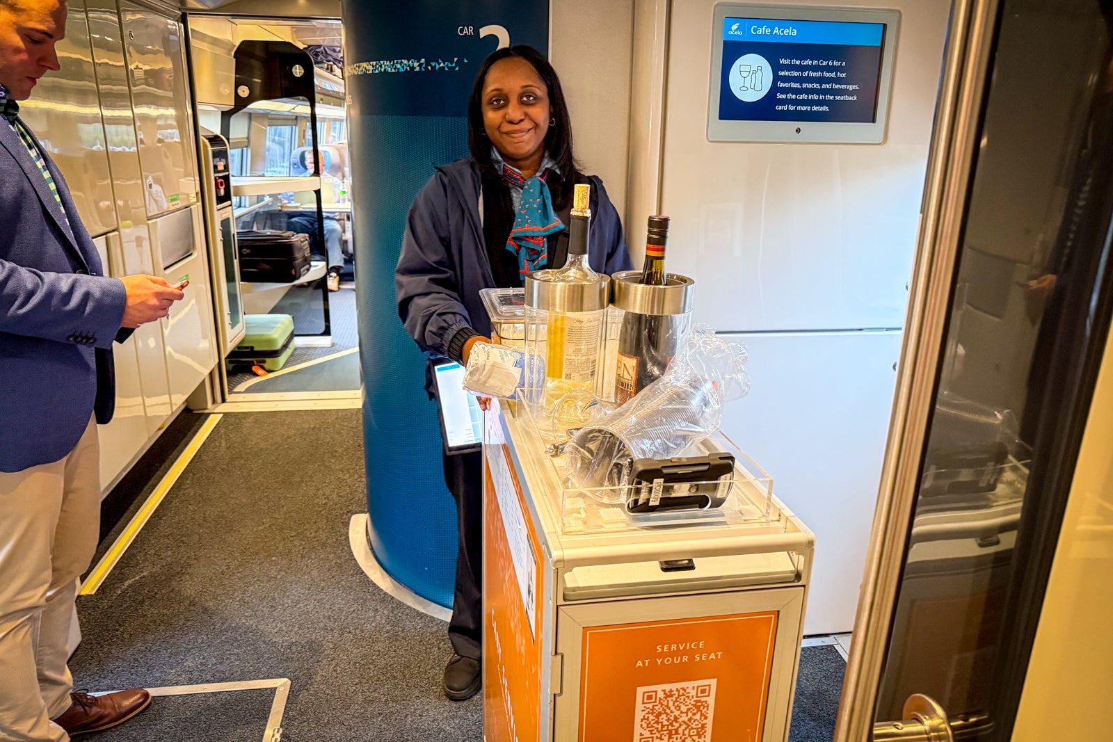 Boarding was chaotic with a long line to get into the first-class car. It wasn't the workers' fault, though, as there was a passenger in a motorized wheelchair who needed to be boarded before the rest of the passengers. We ended up leaving the station about 15 minutes late.