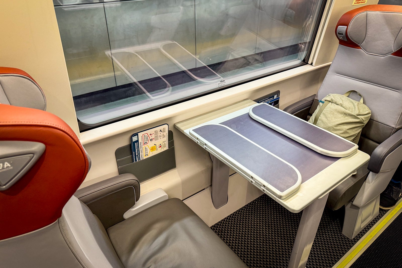 Similar to first class, there are tray tables and leg rests at every seat. A seatback pamphlet describes the food available in the cafe car or via cart service.