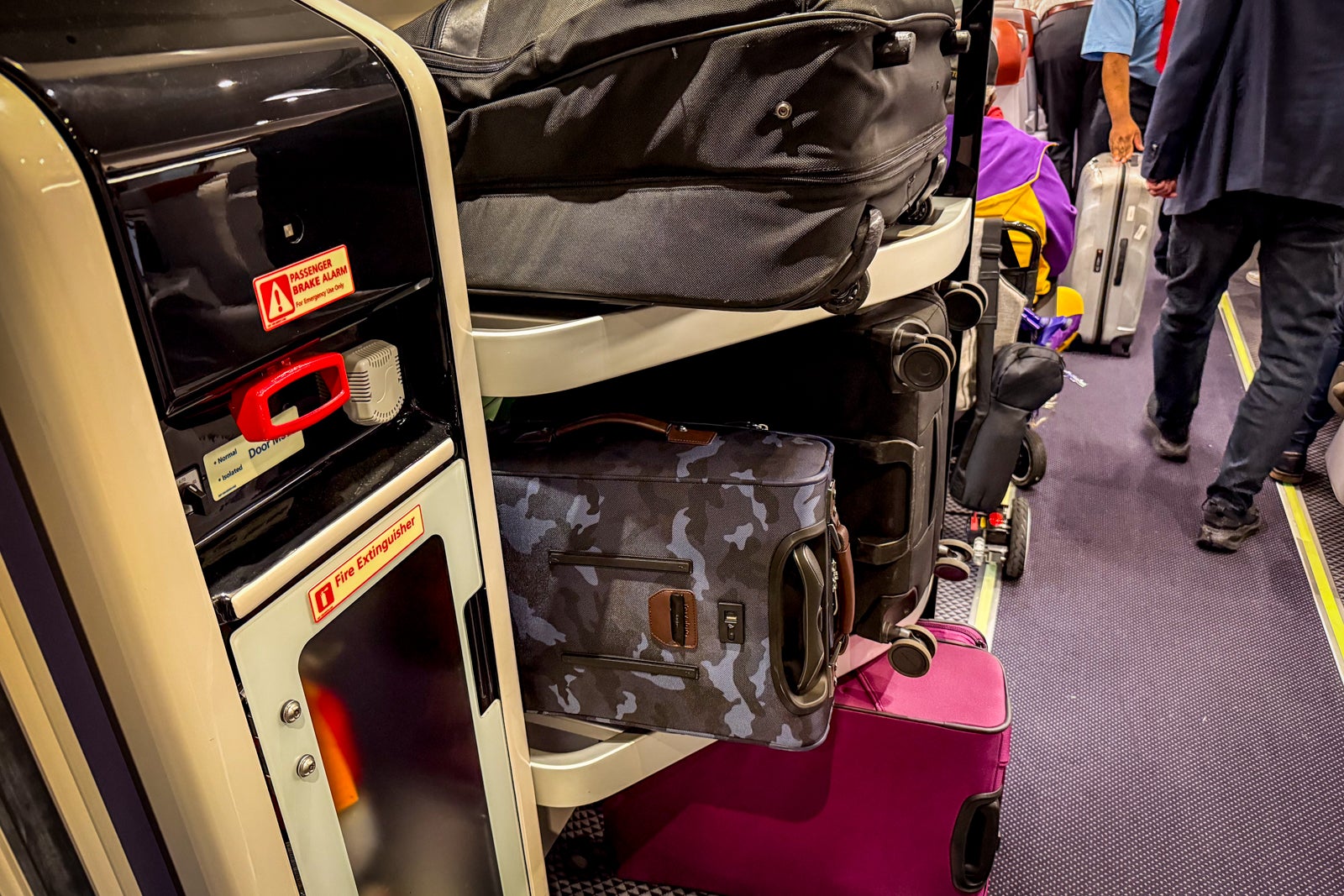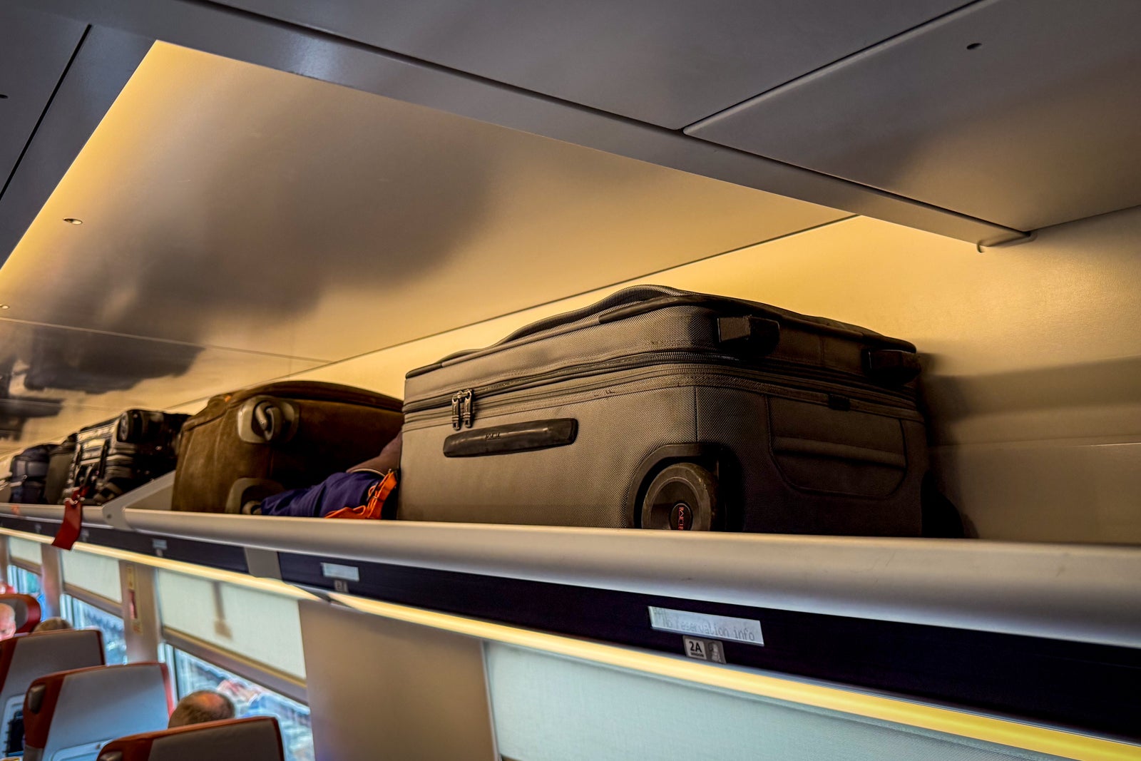 There was plenty of overhead space on the open racks above the seats, though a full-size suitcase could feel a bit precarious up there.