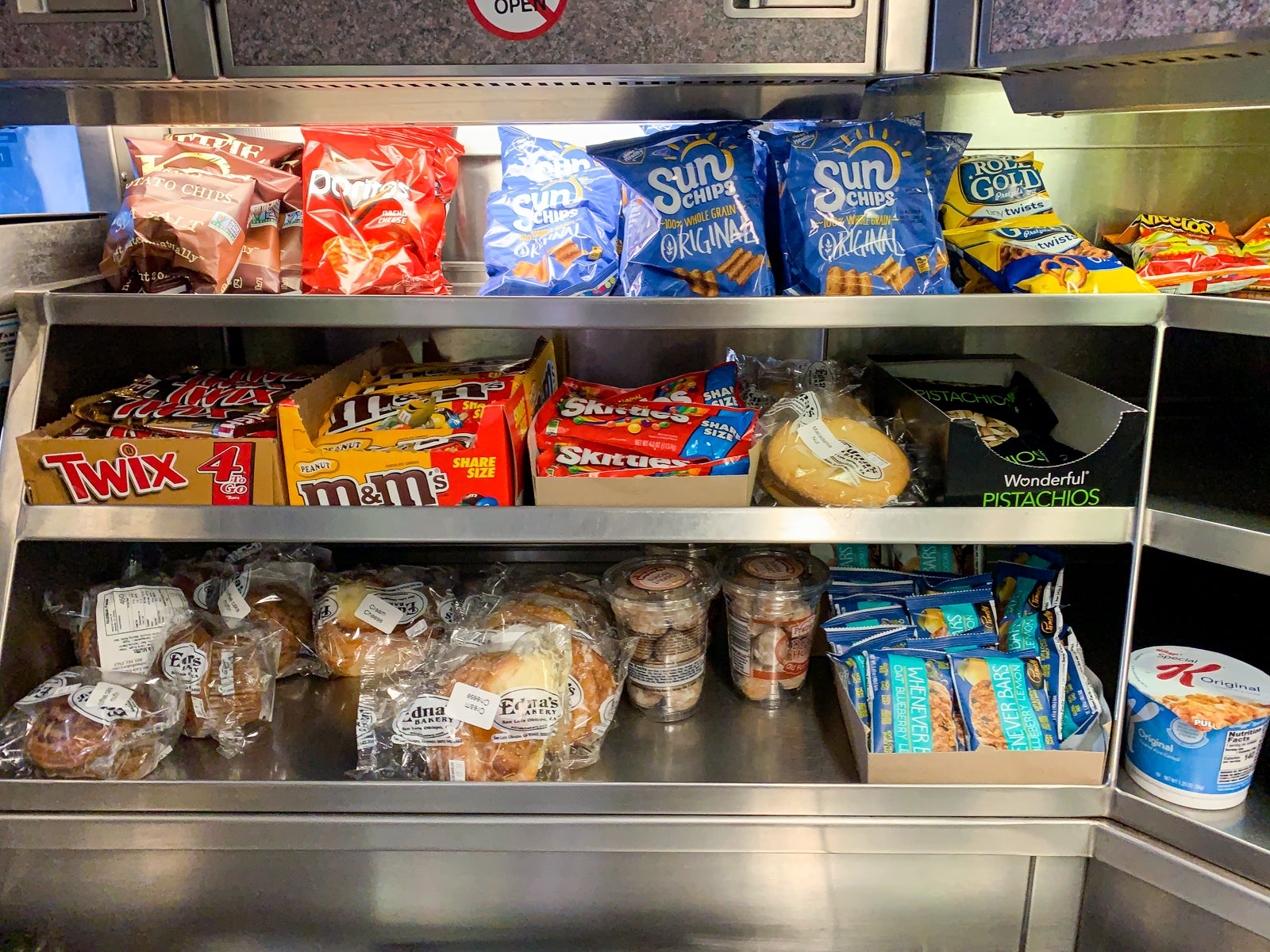 There were packaged snacks and hot food available from the snack car's Market Cafe. You could find pizza or cheeseburgers for about $6, alcohol from $6-$15, or a kid's snack pack for $5 — but don't save stomach space for it, necessarily. There weren't any can't-miss items here. For example, the pizza and cheeseburgers are frozen, then taken out of their packages and heated on the train.