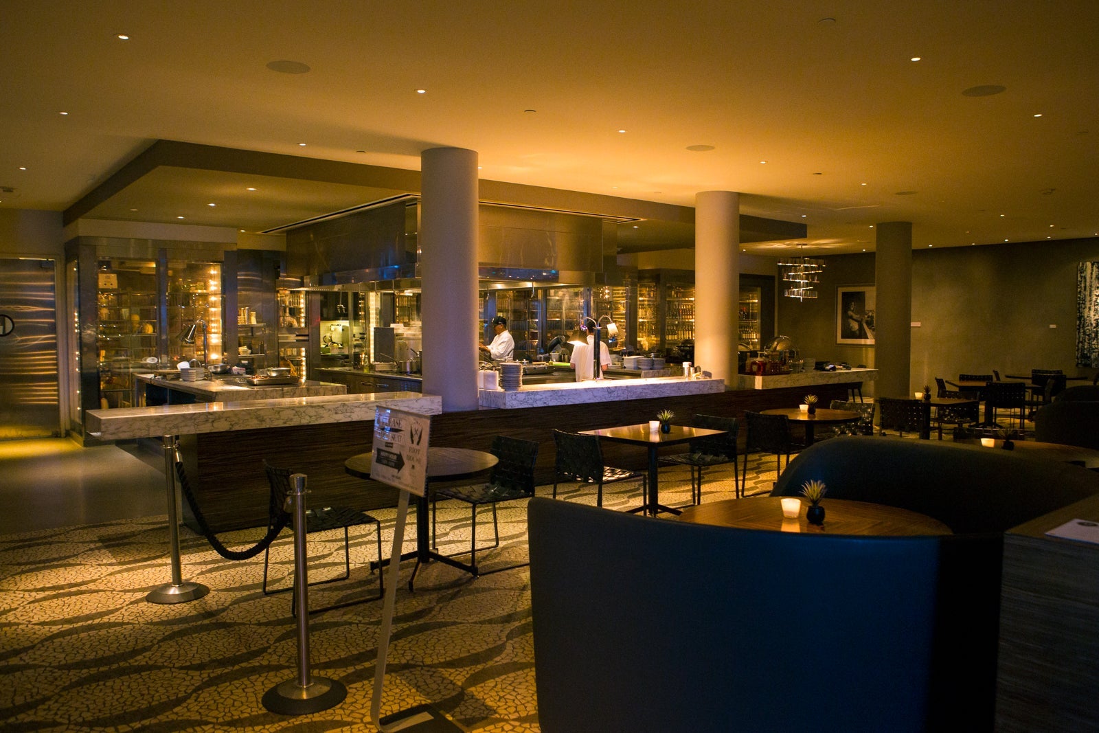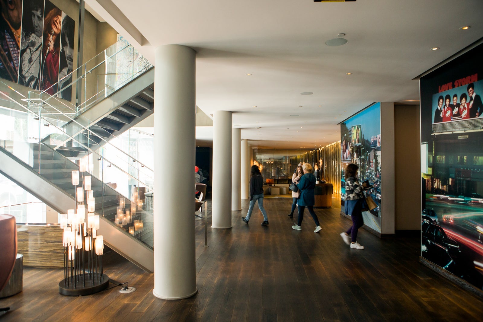 The hotel sat shiny and boxy on a short, shallow jughandle off of the Strip, and since I came in a ride-hailing car, the valet didn't greet me, so I walked in alone to the short check-in line. Though the hotel was done up with homages to its past — images of Jerry Garcia and Janis Joplin, among others, sang down to guests from over the entrance — the place was fairly brisk and businesslike, with a small sitting area by coolers of fruit-infused water. The check-in desk was on one side of the entrance and the hotel restaurant on the other, past the sole Mac computer that served as a business center. A staircase led up to the fitness center and meeting rooms and a small, temporary Joni Mitchell photography exhibit.