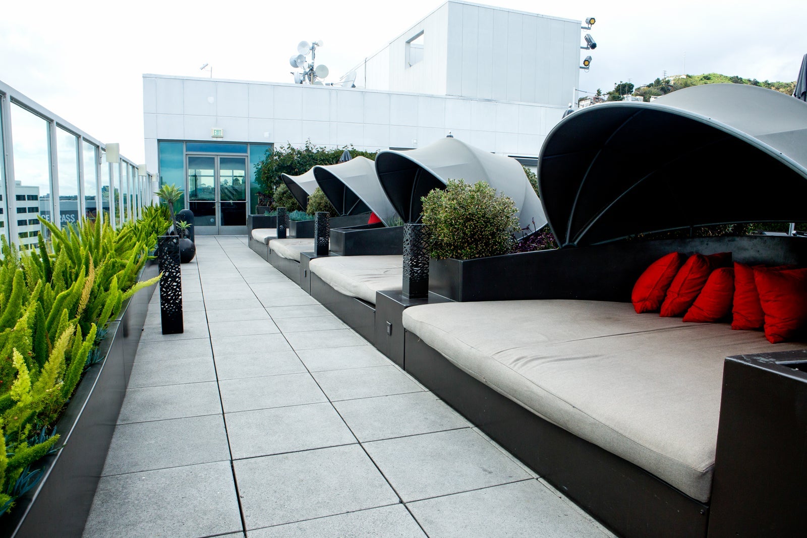 A row of shaded loungers overlooked the city on the south side, an untended bar hugged the stairwell entrance to the west, and a bright red tent filled with service paraphernalia — suggesting in-season poolside wait service — did a poor job of hiding behind a potted tree to the east. On the near end of the pool was a chair crane for easing people with mobility issues into the shallow end.