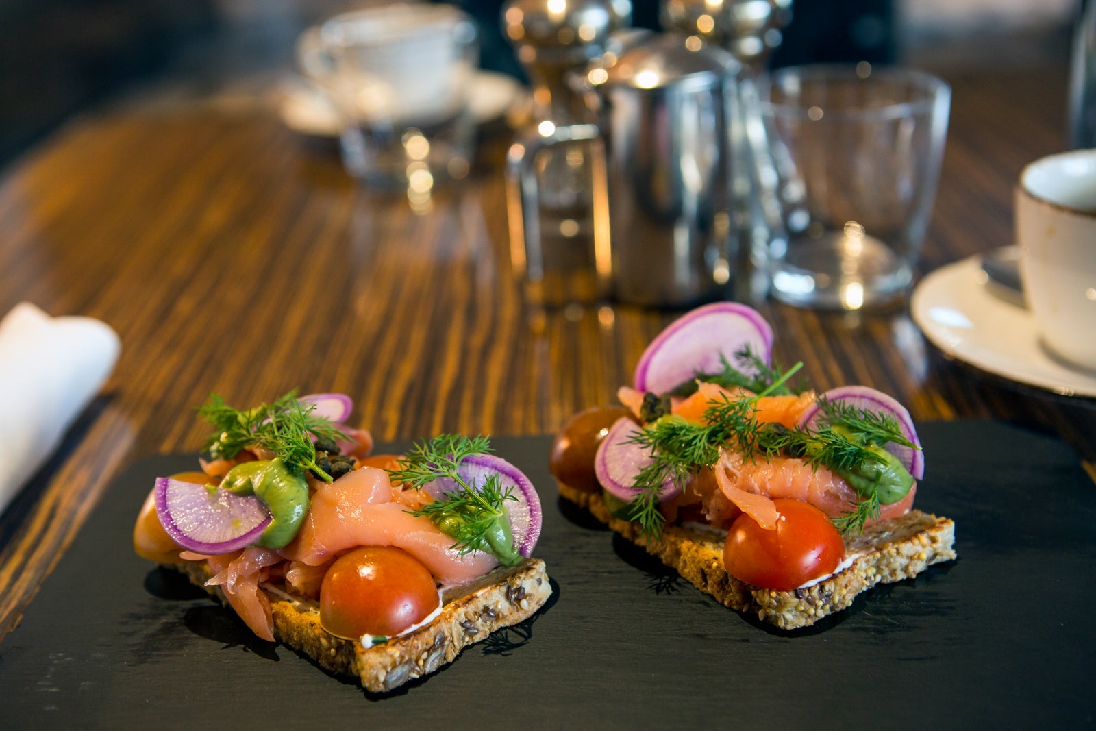 I, however, ordered a la carte, getting a coffee ($5) and the salmon avocado toast ($15), which was far more generous and filling than it looked, with more fresh salmon than I could finish. I'm not a light eater. It came on a slate that would have been the perfect size to carry around and write on with a piece of chalk if I ever lost the ability to speak but decided learning sign language was too much bother.