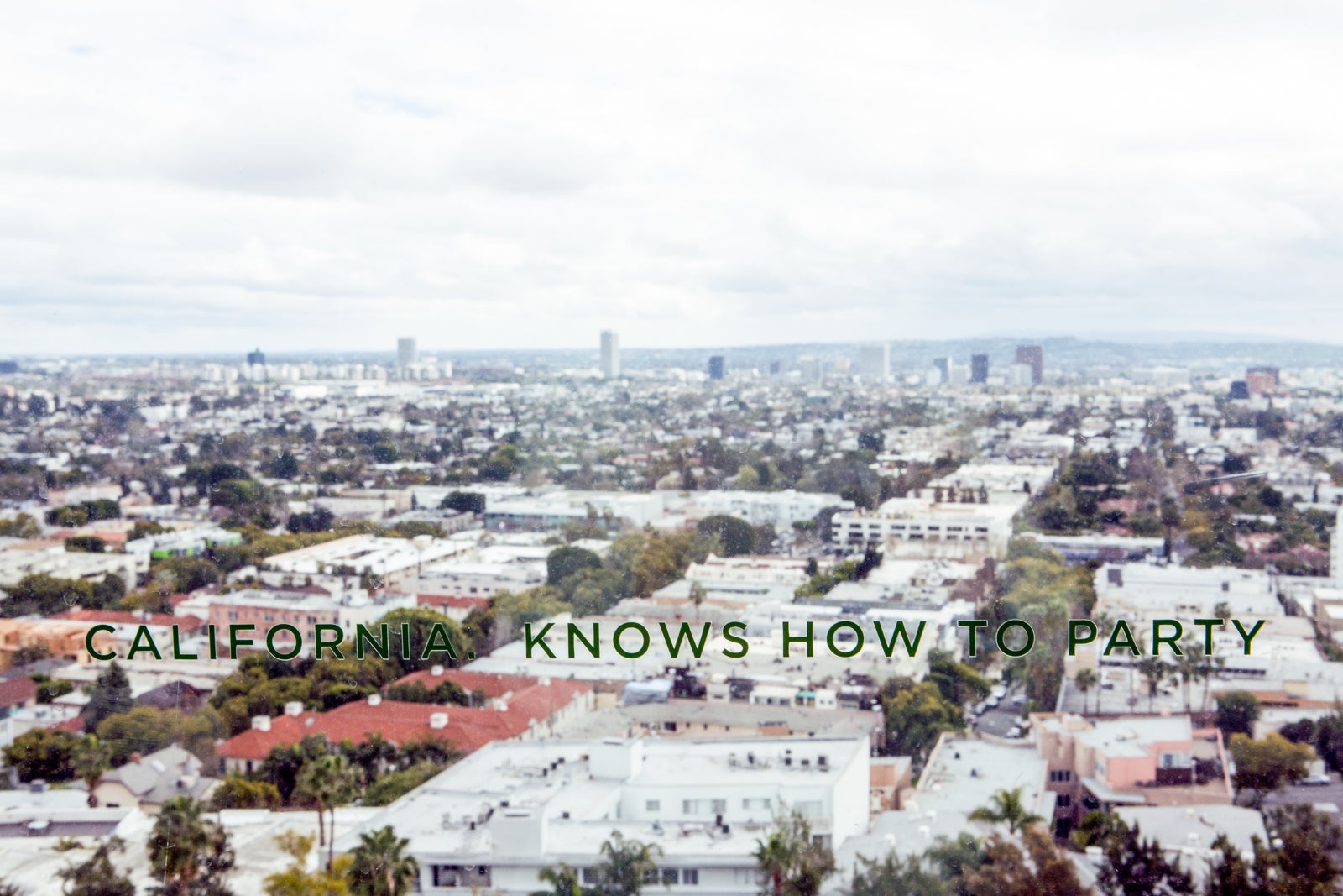 Clearly, the view of Los Angeles from the huge windows was the best feature of the room. They looked south toward what I convinced myself was the barely visible ocean, and the hotel had stenciled the phrase "California knows how to party" in the middle. No comment.