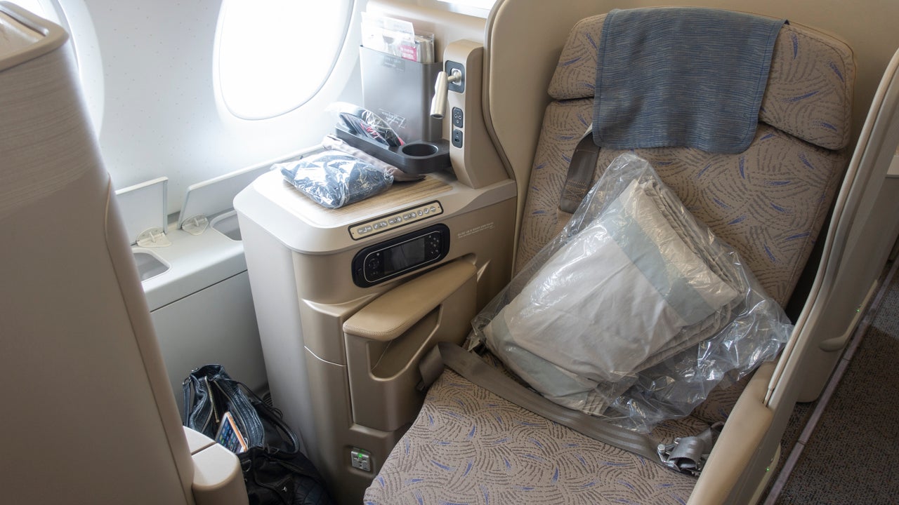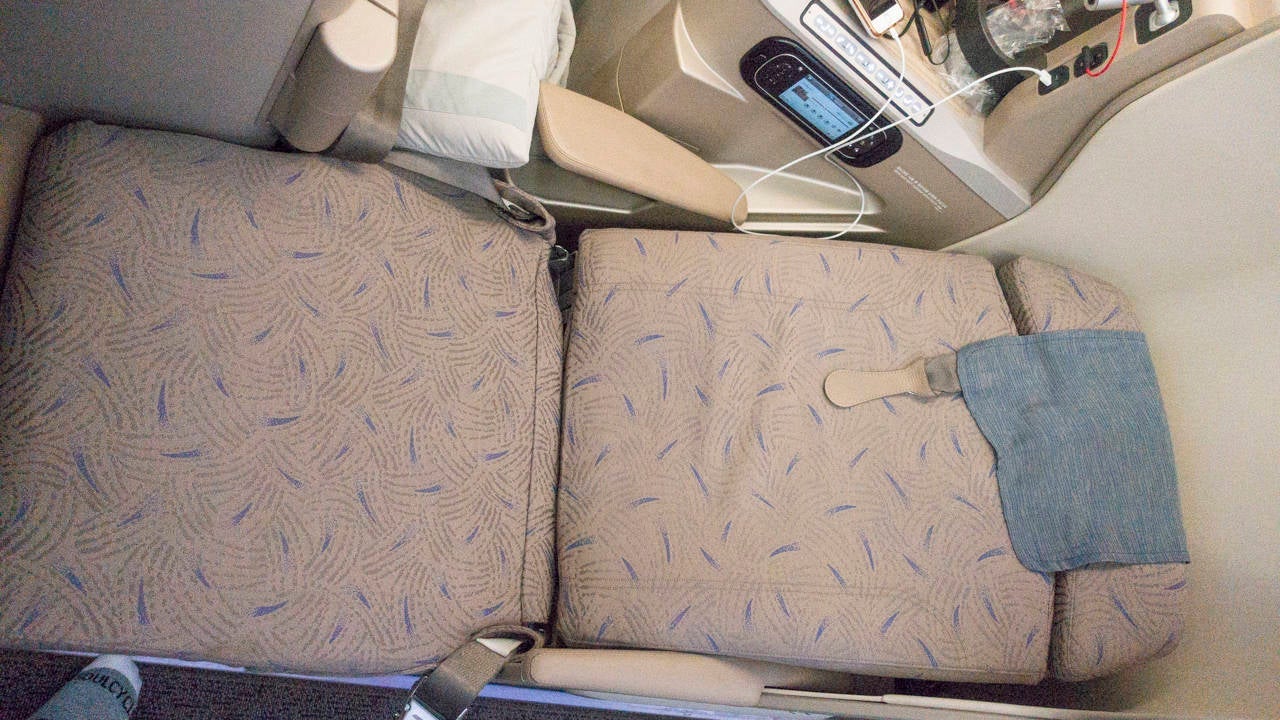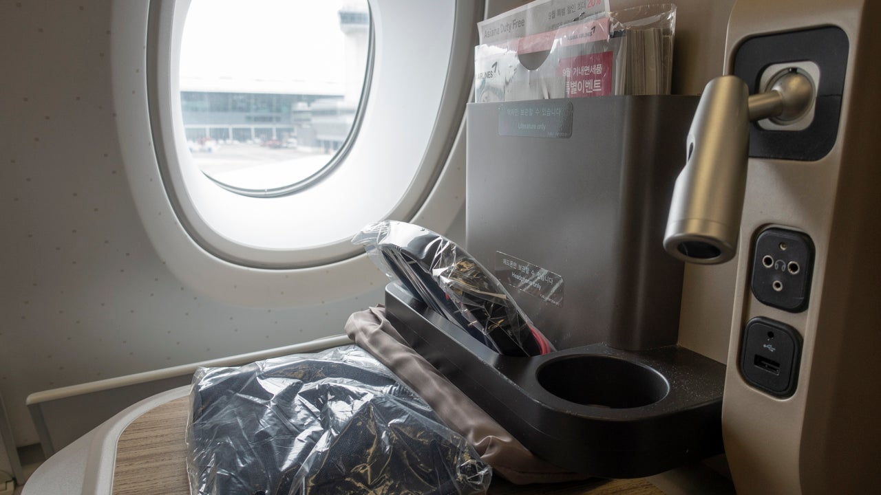 Business class on Asiana's A380 was arranged in a 1-2-1 configuration — so if you're traveling with someone, you'll want to snag those two seats in the middle. The beauty of this configuration, though, was that no matter which seat you were in, you had direct aisle access. Word to the wise, though: If you're sitting in a solo window seat, aim to sit in an odd-numbered A or K seat so you have added privacy, since these seats are protected from the aisle. I didn't call ahead early enough to select my seat, so I ended up in an even-numbered seat. Rookie mistake.