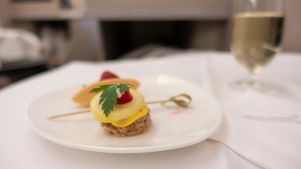 Lunch started off with Korean-inspired bites — and wine, always wine. The flight attendants continually filled my glass of riesling, so no complaints here about that.