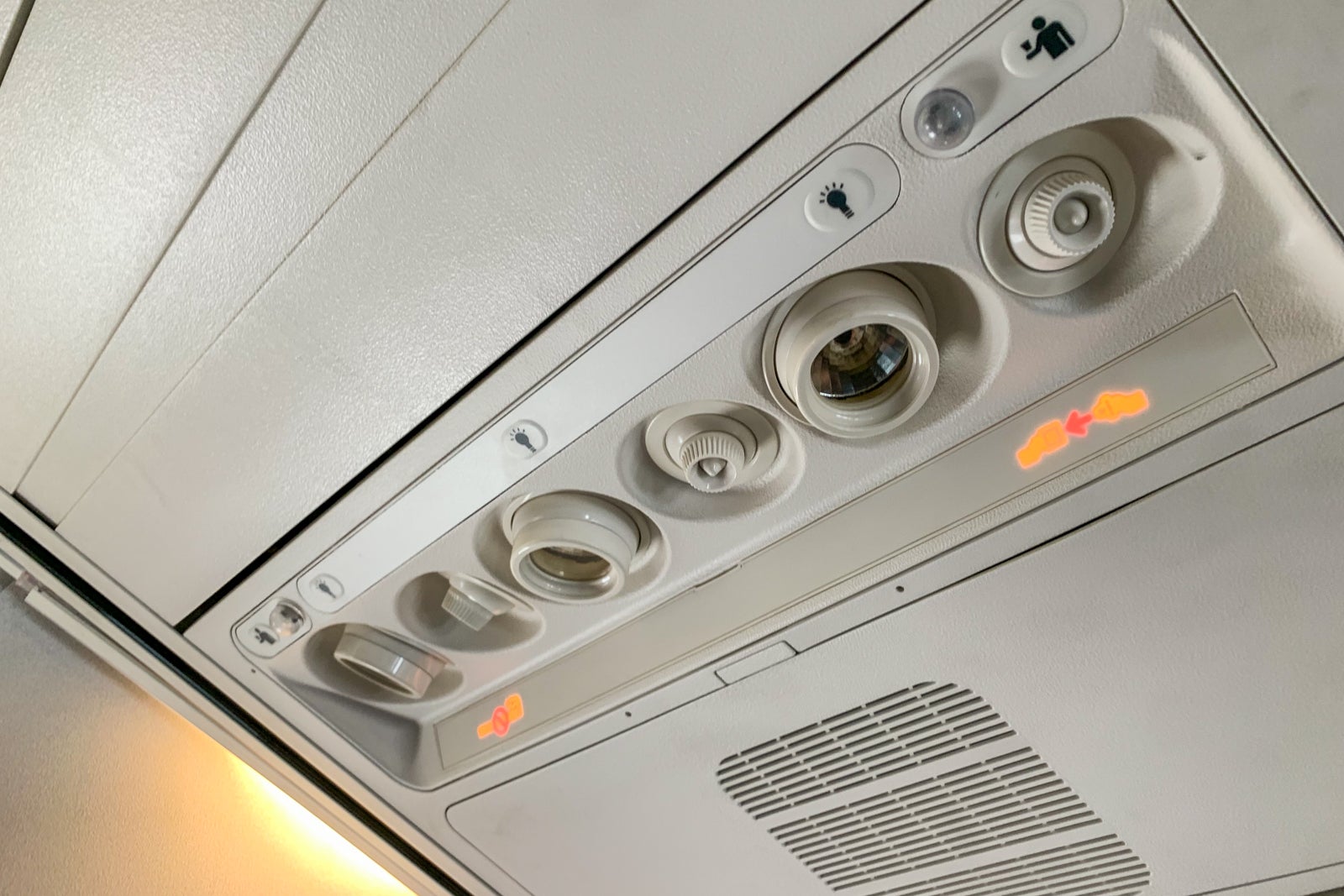 I purchased seat 1C for an extra $39. I needn't have bothered. There was great legroom, but the seats were narrow and didn't recline. I measured the waist area of the seat at 17 inches and the seat measured 16.5 inches at the shoulder. Unfortunately for me, all bulkhead row armrests are fixed — that means that the tray table prevents your hips from expanding past the 17 inches of the seat. On my flight home I was happy to not be in the bulkhead row.