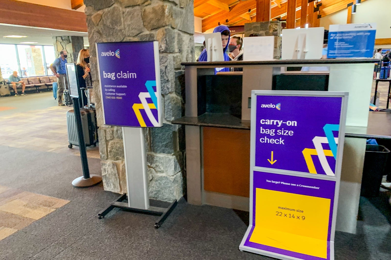 The Avelo check-in area at BZN, with oversize luggage sign. (Photo by Clint Henderson/The Points Guy)