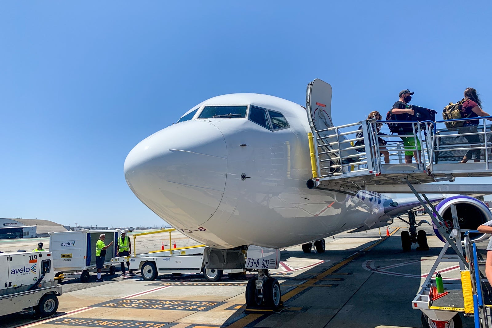 Avelo jet at Burbank Airport in 2021. (Photo by Clint Henderson/The Points Guy)