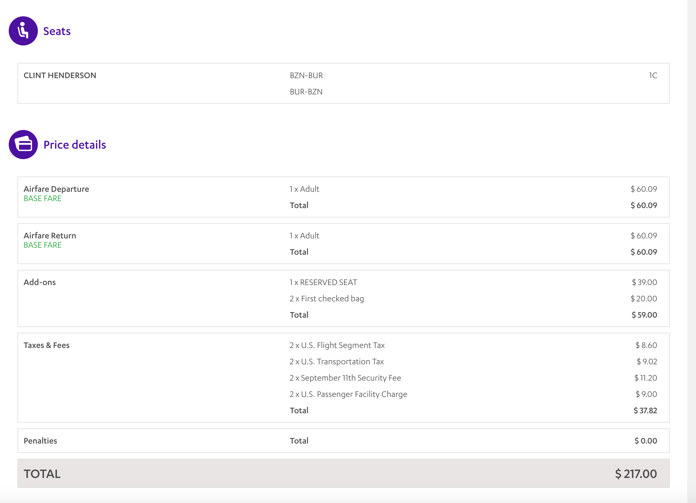 While the base fare each way was just over $60, I paid almost $38 for taxes and fees, and I also paid $10 each way for a checked bag (that's a major deal since most airlines charge at least $25). I also splurged on my flight from Bozeman to Burbank, spending an extra $39 to pick the first-row aisle seat. That's the biggest charge for seats the airline offers. I wanted to test it out for TPG readers.