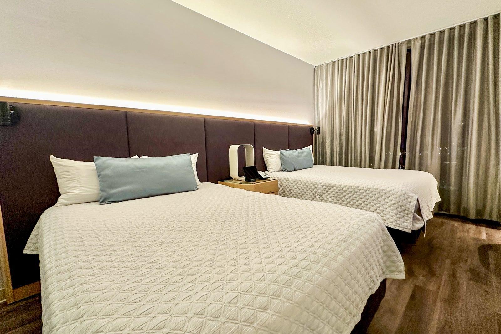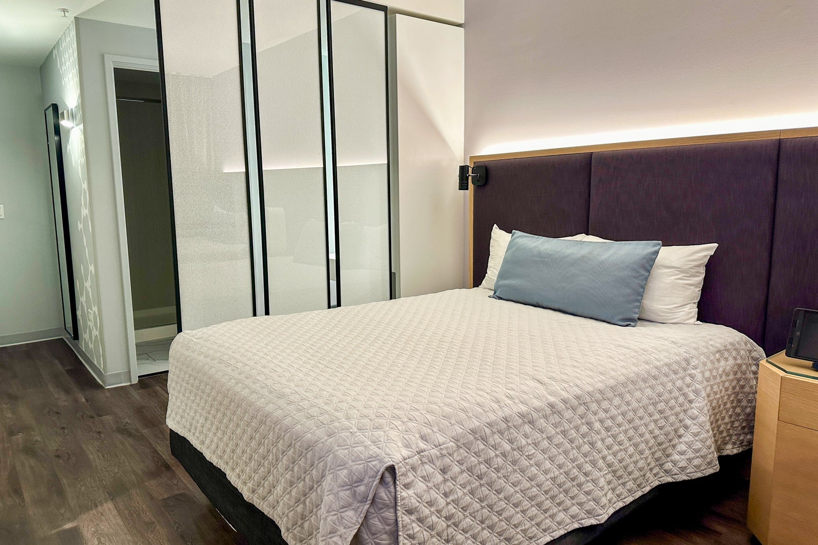 Universal's Aventura Hotel's standard rooms have one king or two queen-size beds. King rooms have a sitting area with a sleeper sofa, and queen rooms have a plush accent chair. The color scheme is subtle and spa-like, with rich hardwood floors, light gray walls and bedding, and accents of soft blue and deep purple, all combining to yield a calming vibe. The panels separating the bedroom from the bathroom allow some light to come through, making the room feel more open and airy.
