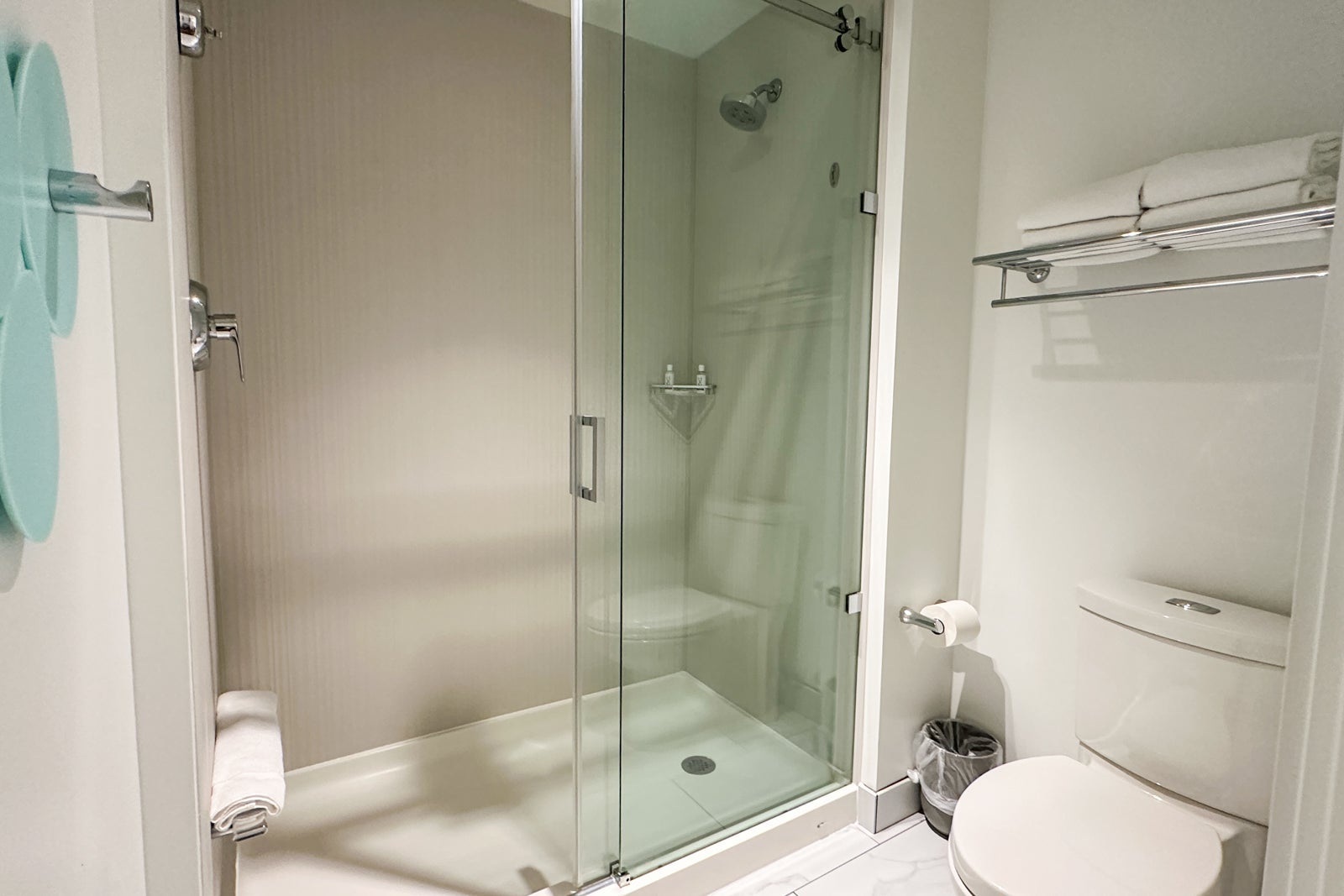 A door separates the vanity area from the shower and toilet in the bathroom. Bathrooms here have only a single vanity, but there is storage next to and underneath the sink and a hook on the back of the bathroom door if you use a hanging toiletry kit. The shower is spacious and has a shaving ledge.