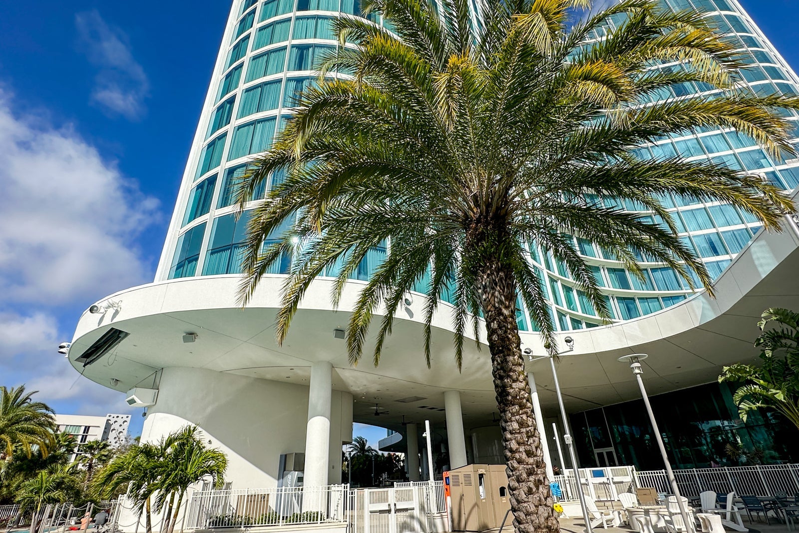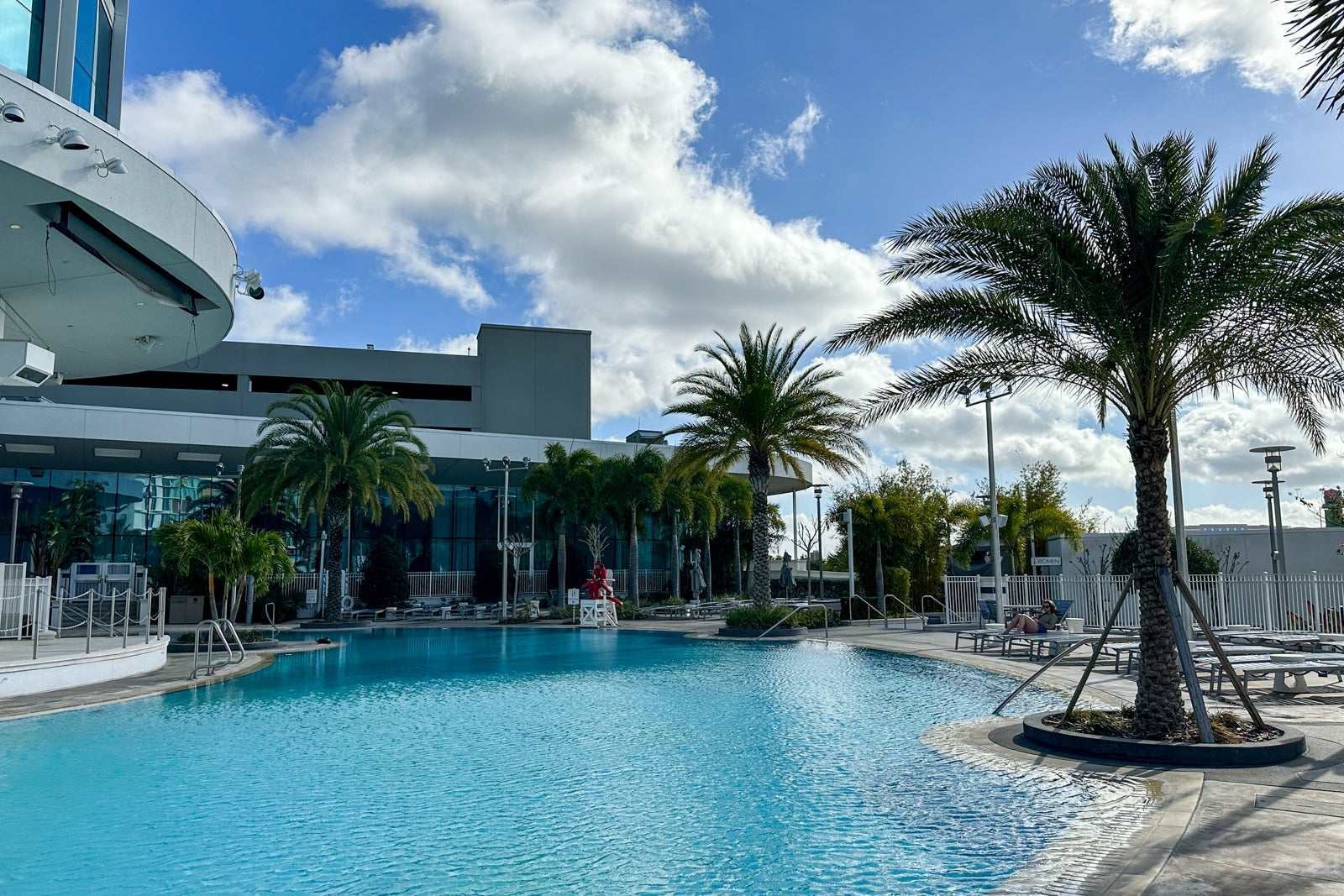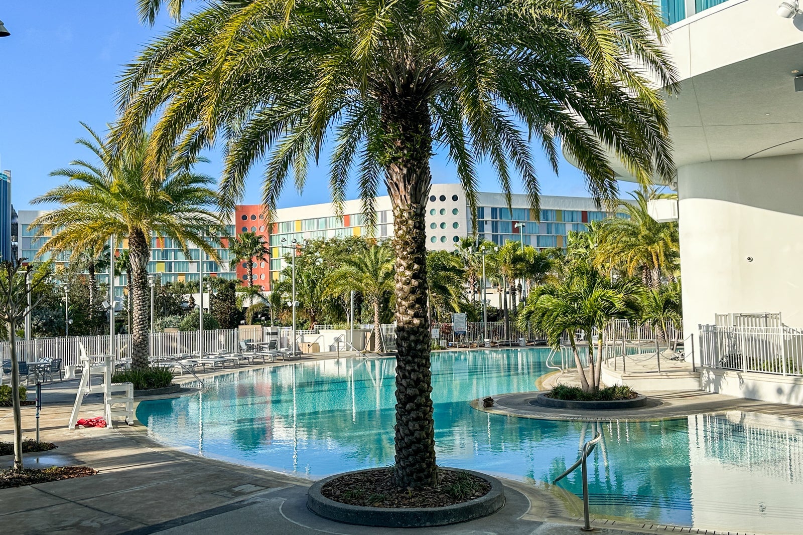 The pool at Universal's Aventura Hotel curves around the hotel, which gives it a quiet, private feel. There is ample seating, and palm trees surrounding the pool offer shade.