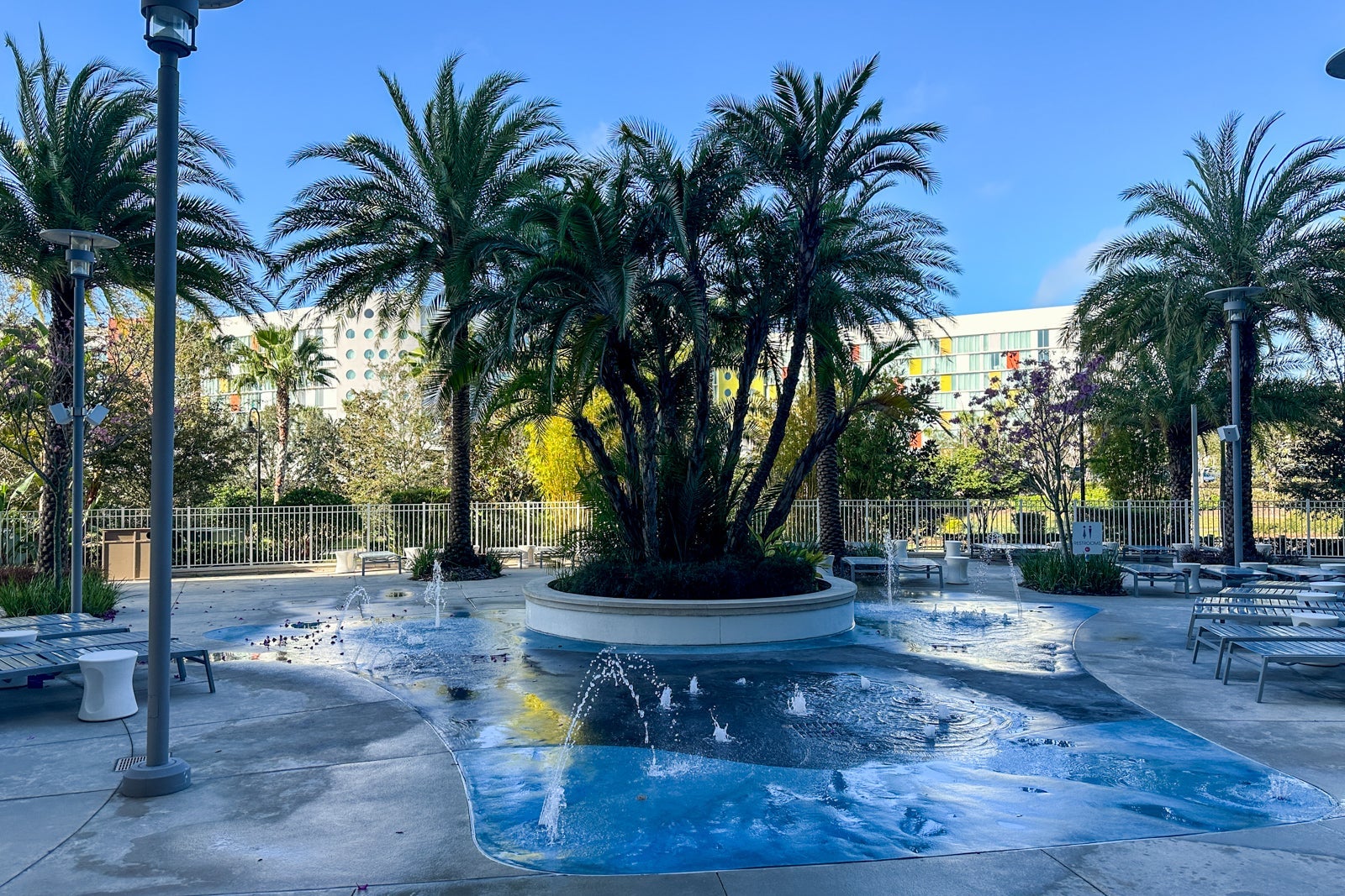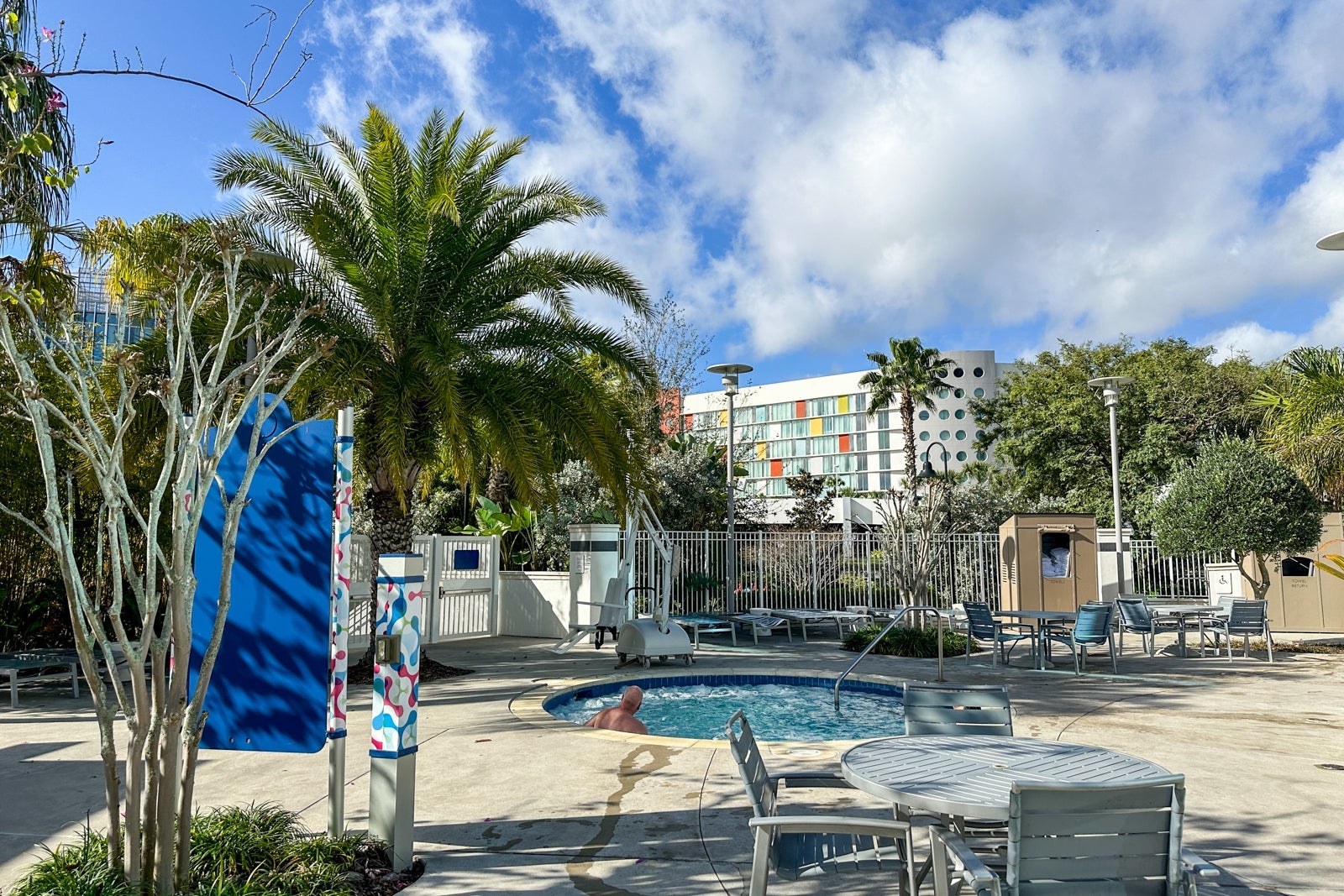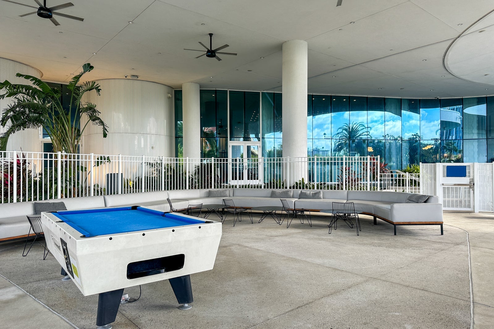 The pool at Universal's Aventura Hotel curves around the hotel, which gives it a quiet, private feel. There is ample seating, and palm trees surrounding the pool offer shade.