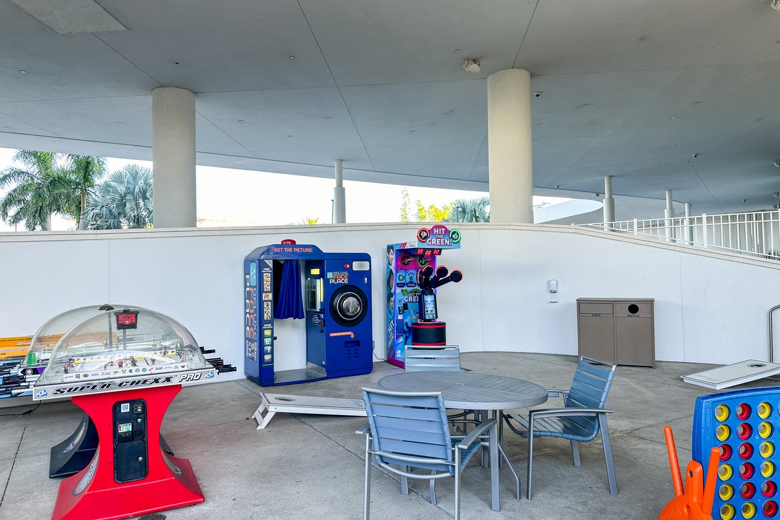 The pool has a hot tub and a kids' splash pad with fountains. Next to the poolside lounge, you'll find an outdoor game area with a pool table, yard games and arcade games.