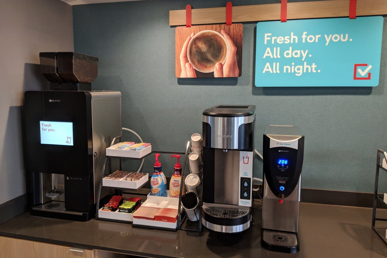 Instead of kettles or coffeemakers in each room, the hotel provided complimentary coffee, hot water, still water and sparkling water in the lobby 24 hours a day.