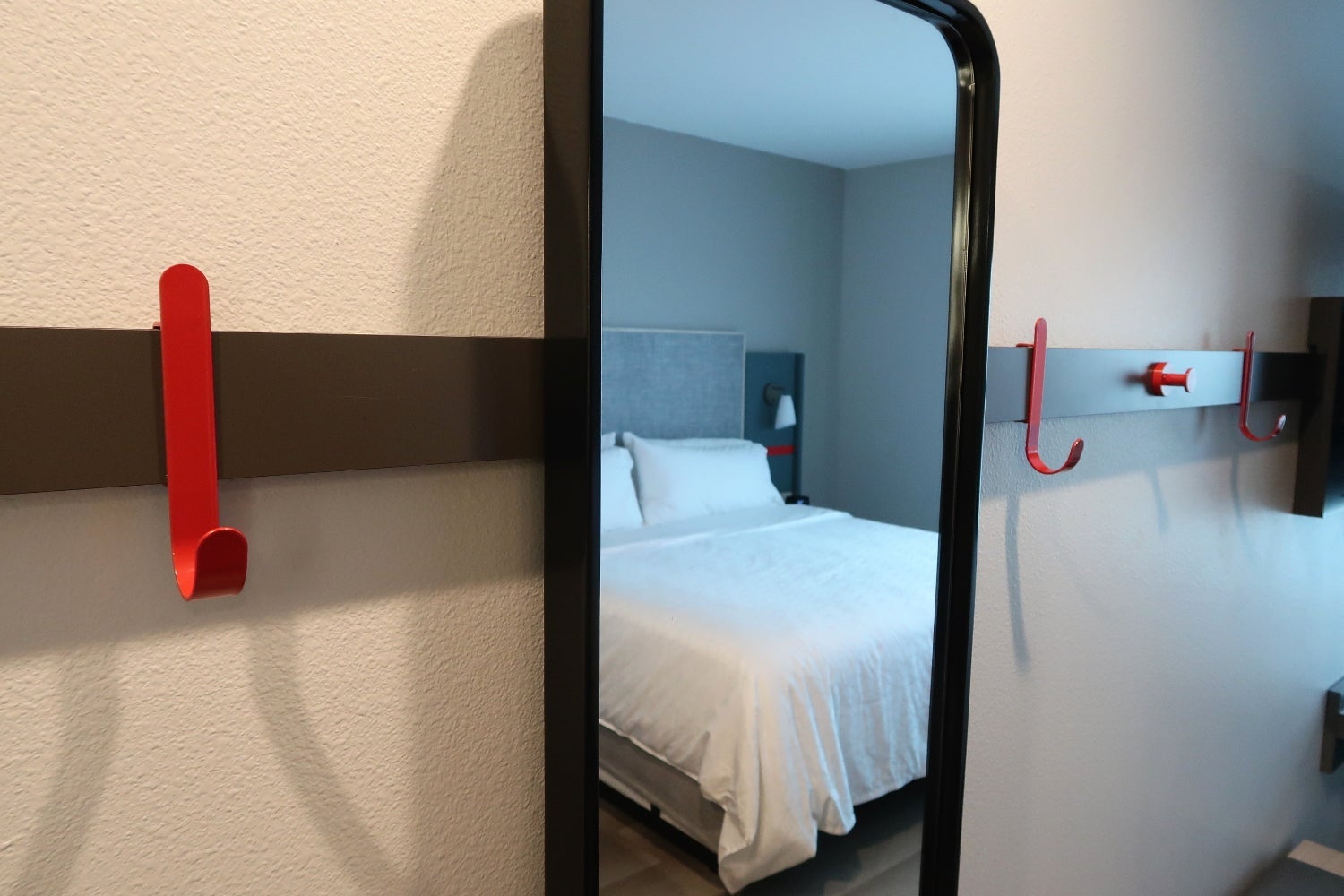 Next to the desk and below the TV was a padded bench for luggage or sitting. Above the bench were two hooks. A third hook was next to a full-length mirror and then another hook was on the other side of the mirror toward the entrance.