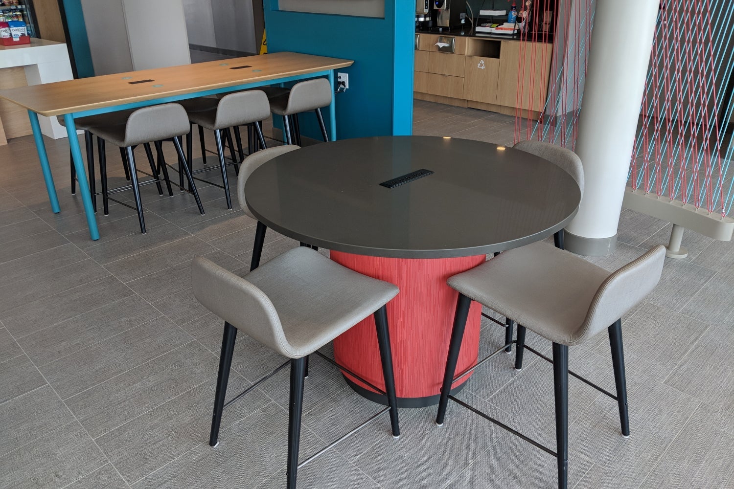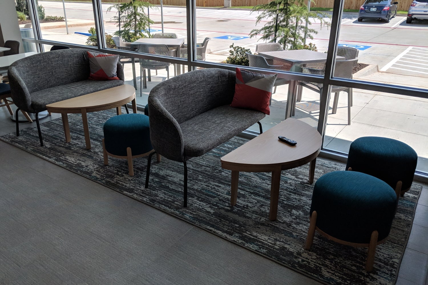 The lobby had a variety of sitting areas, ranging from large tables to couches. Most of the tables made charging easy with power ports and wireless charging. However, the lobby contained no sound-absorbing materials — which was obvious to us because several kids soccer teams stayed at the hotel during our weekend stay.