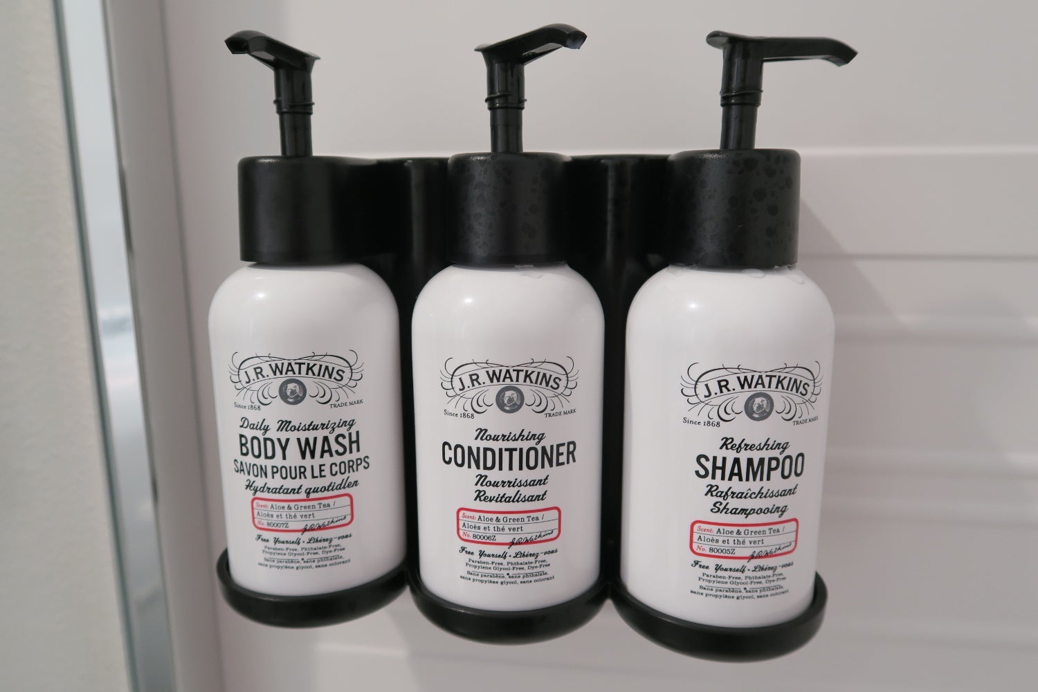 Large bottles of shampoo, conditioner and body wash were mounted in the shower. Although many people dislike these large bottles, I appreciated the more ecofriendly approach. The aloe-and-green-tea-scented amenities smelled great.