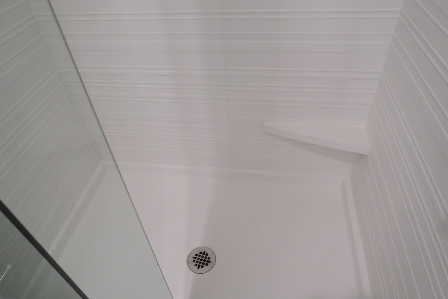 Across from the sink and toilet was a walk-in shower, which had good water pressure and a ledge for your foot while shaving.