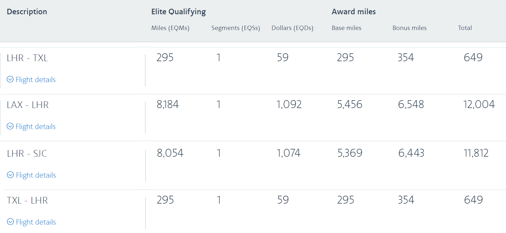 These three long-haul flights stemmed from two bookings. The first was a cheap fare from Berlin's Tegel (TXL) to San Jose, CA (SJC), costing €672 (around $775) round-trip. My wife, Katie, needed to get to a conference in California, so I tagged along for a mileage run, as American Airlines AAdvantage is quite generous on partner premium-economy flights. Credited to AAdvantage, these BA-marketed flights earned a total of 25,114 award miles (after my Executive Platinum elite bonus), 16,828 Elite Qualifying Miles and 2,284 Elite Qualifying Dollars. And that's even with my SJC-LAX leg never posting.