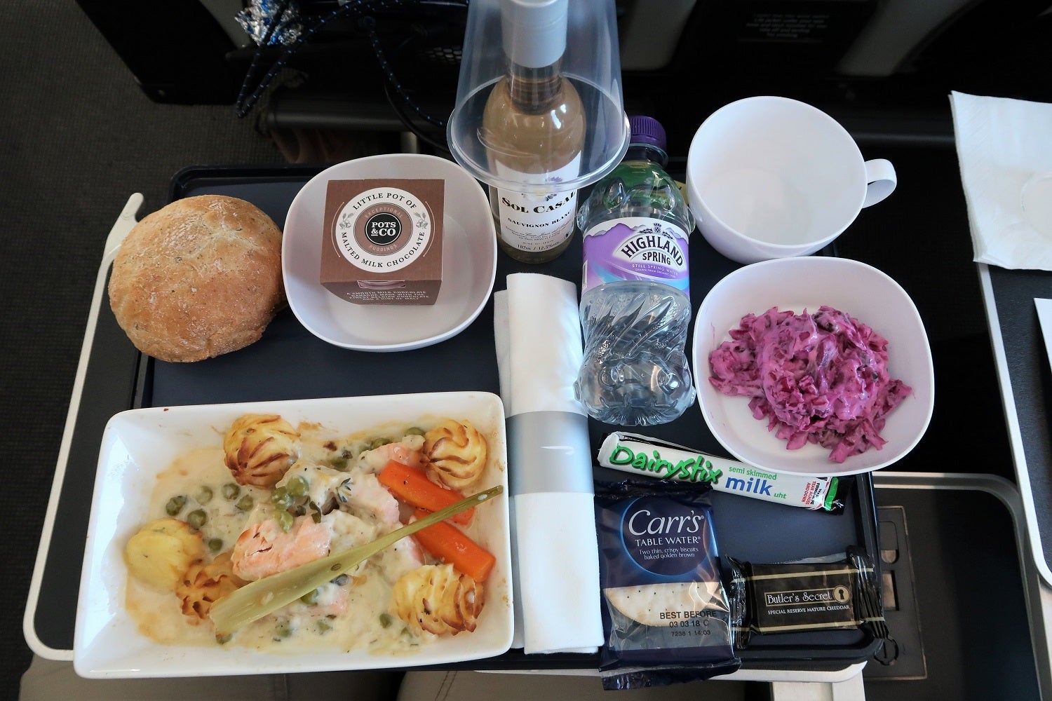 The meal on my flight from Heathrow was the best of the three flights. The salmon and smoked haddock pie with baby fennel, duchess potatoes and a white-wine cream sauce was a very British and delicious choice.