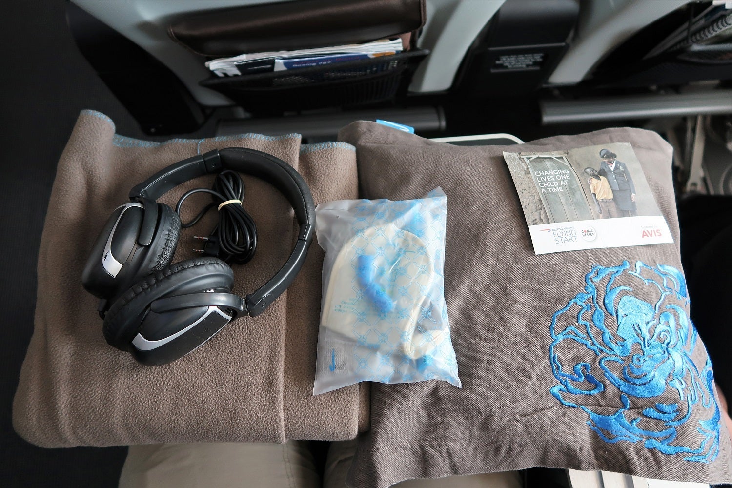At boarding, each seat was stocked with a plastic-wrapped pair of noise-canceling headphones, a basic amenity kit, a plastic-wrapped blanket and a small pillow.