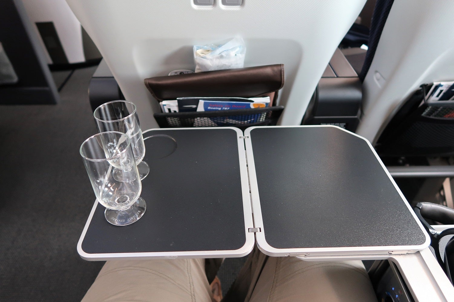 The bifold tray tables felt especially small, measuring 16.5 inches wide by 10 inches deep when extended. They were only barely large enough to hold meal trays, and there wasn't any spare room for drinks or other items during meals.