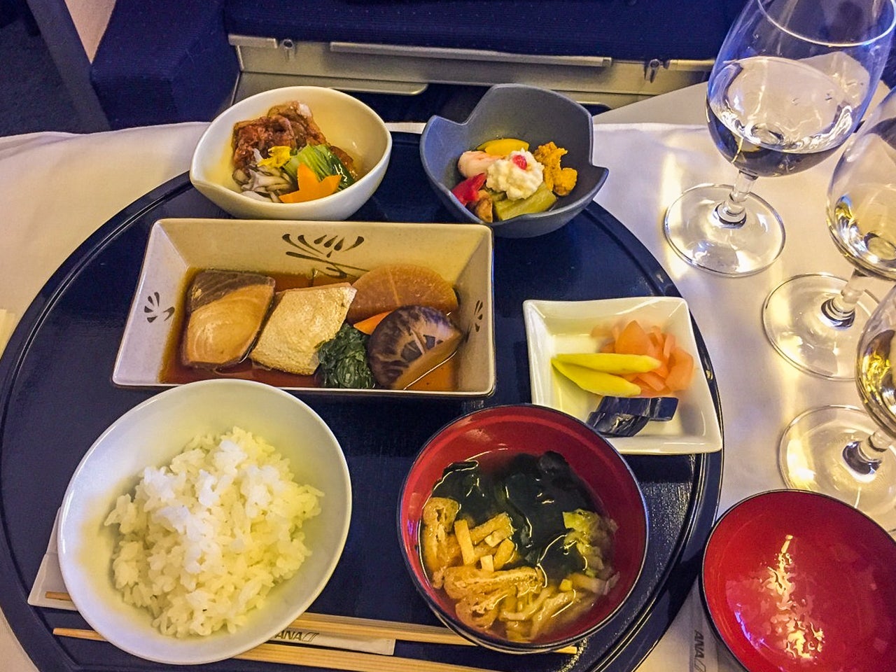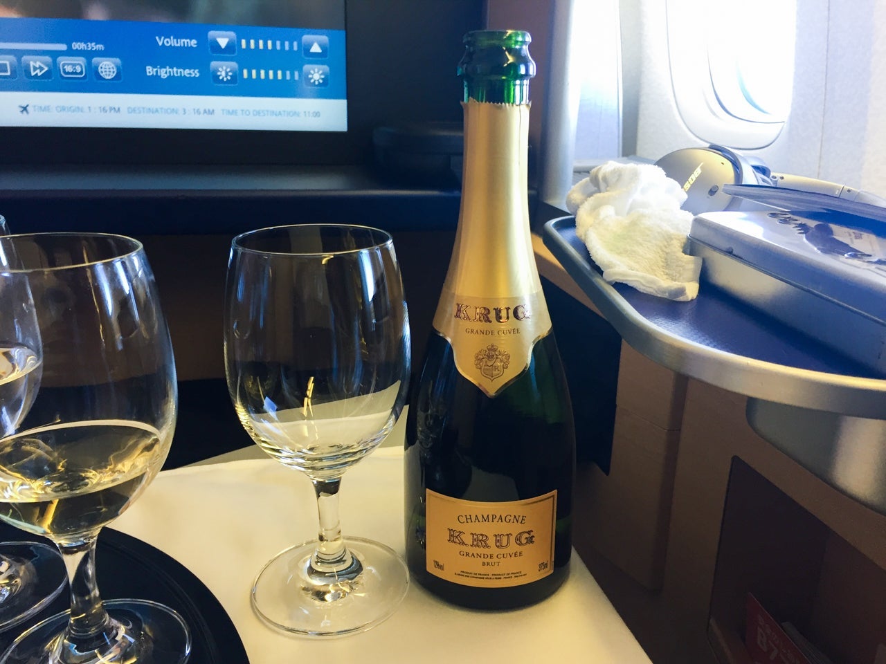 The multicourse feast continued with a sashimi course and a number of Japanese small dishes, a beautiful medley of flavors that were perfectly choreographed to take me on a culinary journey I could not have orchestrated on my own. The flight attendant even left a miniature bottle of Krug Champagne at my seat for me to enjoy at my leisure.