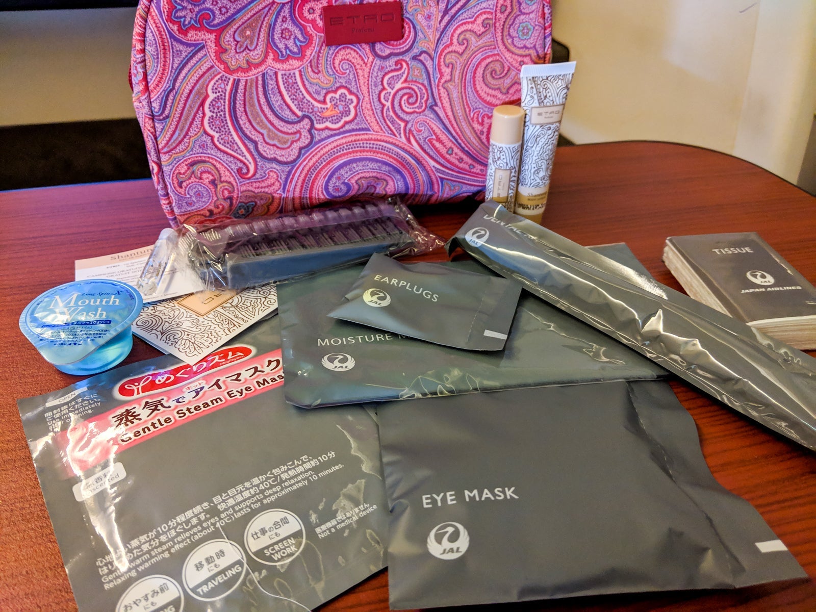 JAL first-class passengers get a fully stocked amenity kit designed by Etro, with different designs for men and women, as well as an additional set of high-end skincare products by Shiseido.