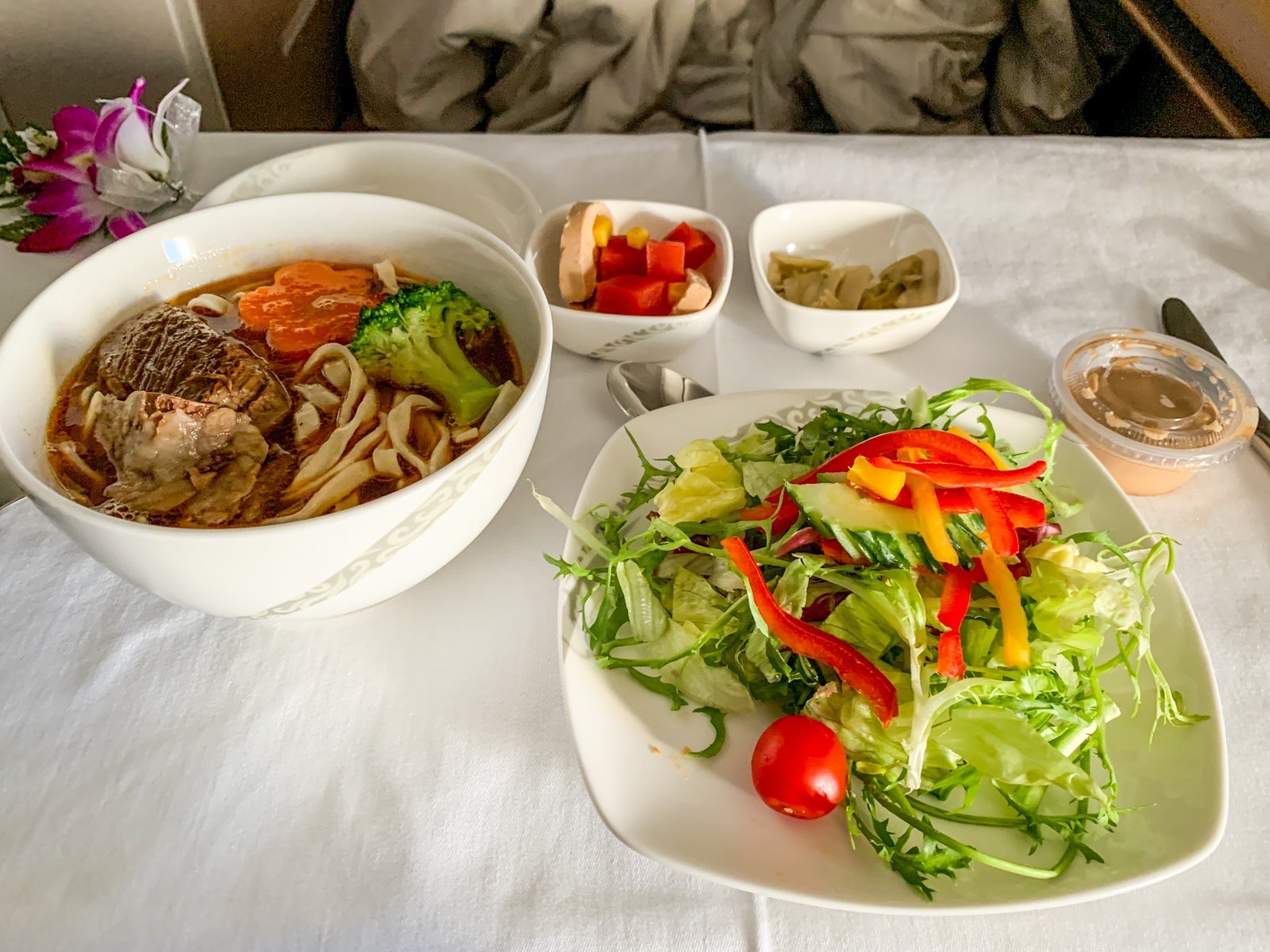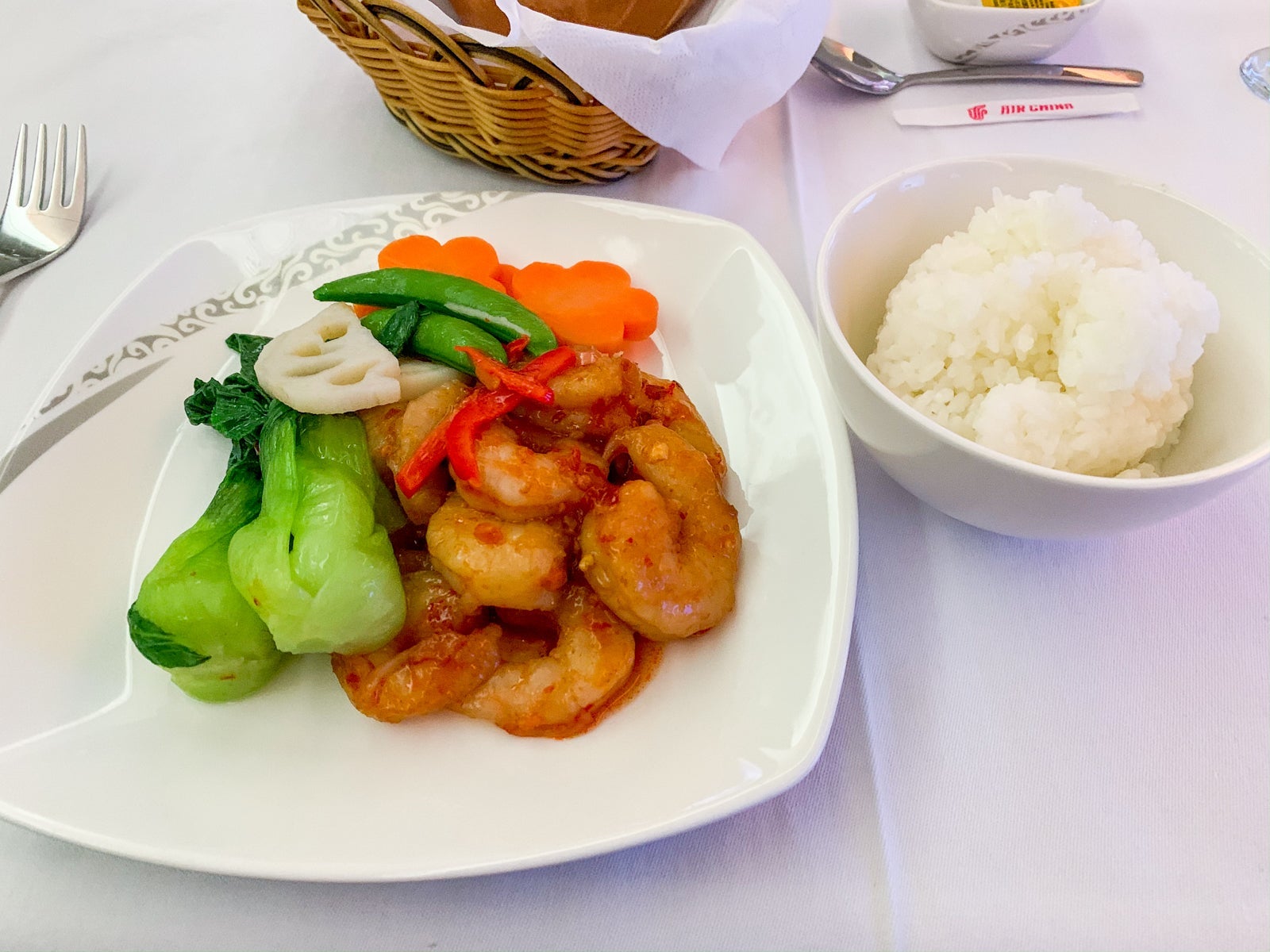 I was even quite impressed by the meal service. I preordered kung pao shrimp for dinner, and unlike my previous premium-cabin flights on mainland Chinese airlines, the rice and veggies were cooked perfectly and actually quite delicious.