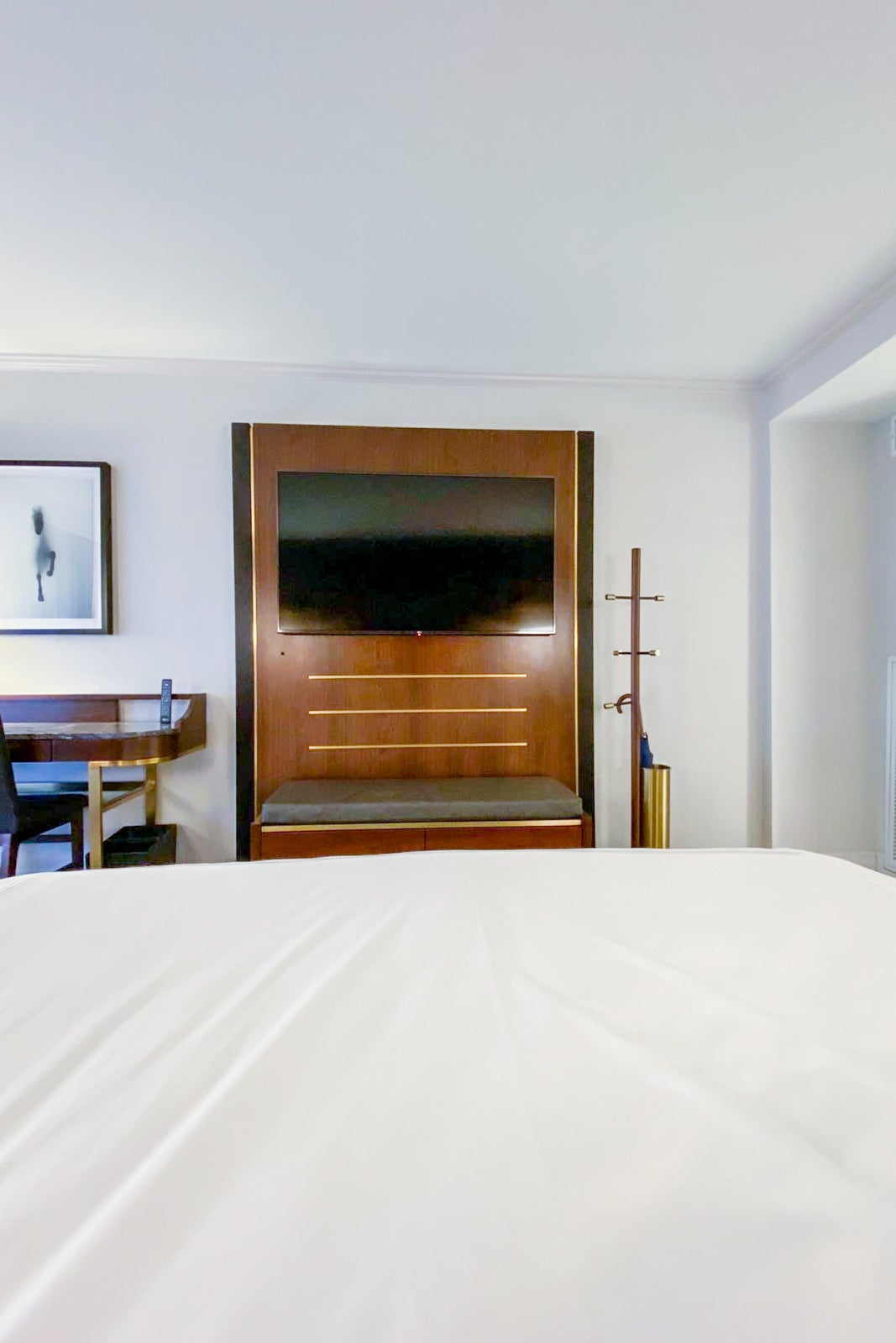 A large flat-screen smart TV was installed directly across from the bed, and comes with Netflix.There was also a coat rack and umbrella stand next to the TV in the corner of the room. I put the umbrella to use and was thankful the hotel provided one.