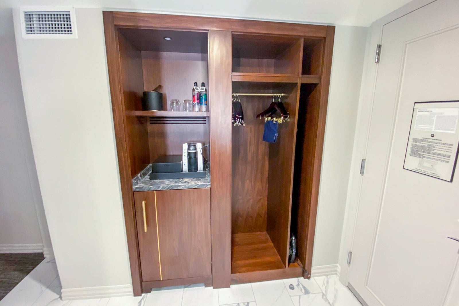 The closet had plenty of hangers, an iron and ironing board. The kitchenette had water for purchase, complimentary Keurig coffee and tea and a minifridge inside the cabinet.