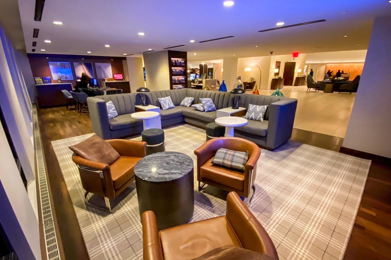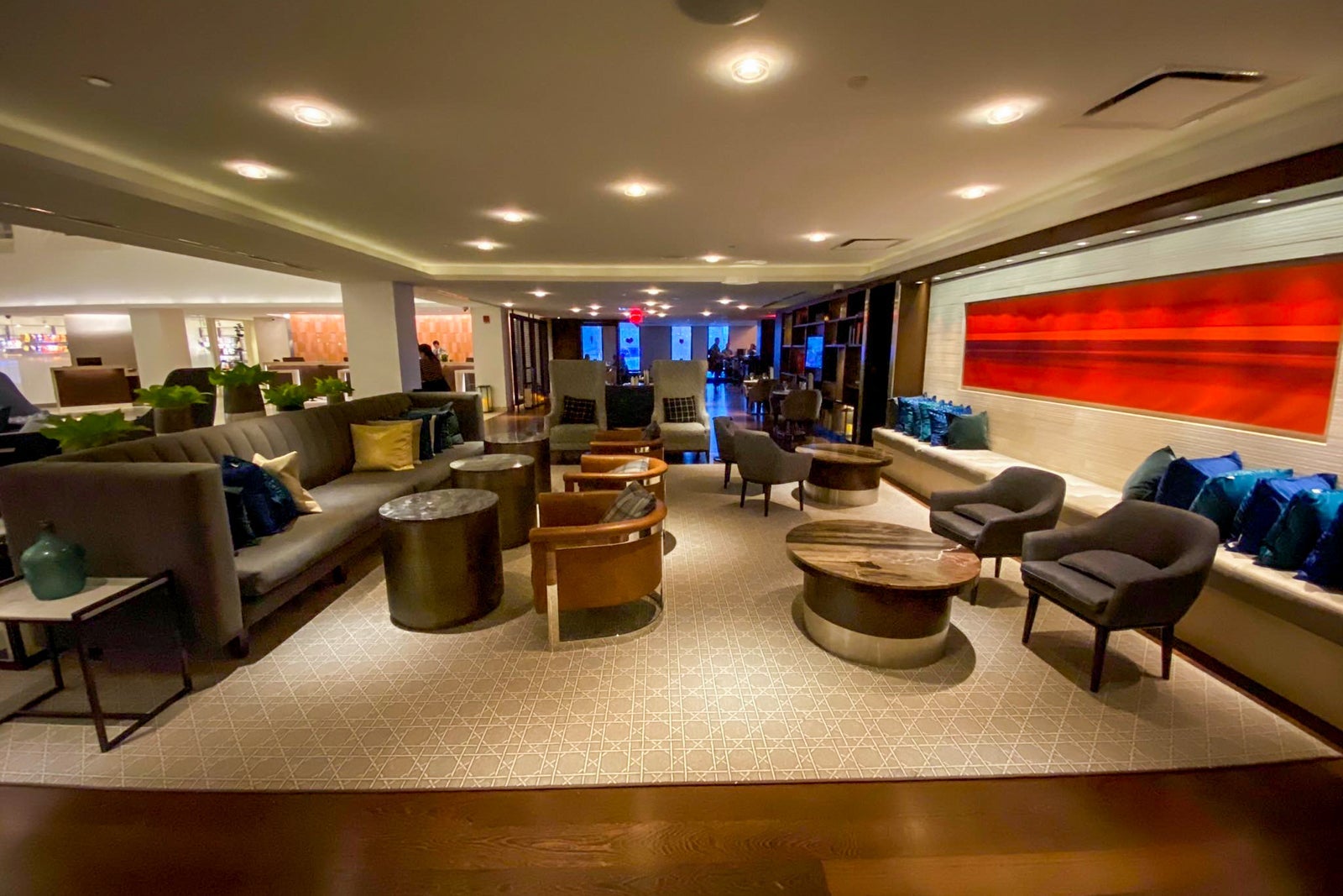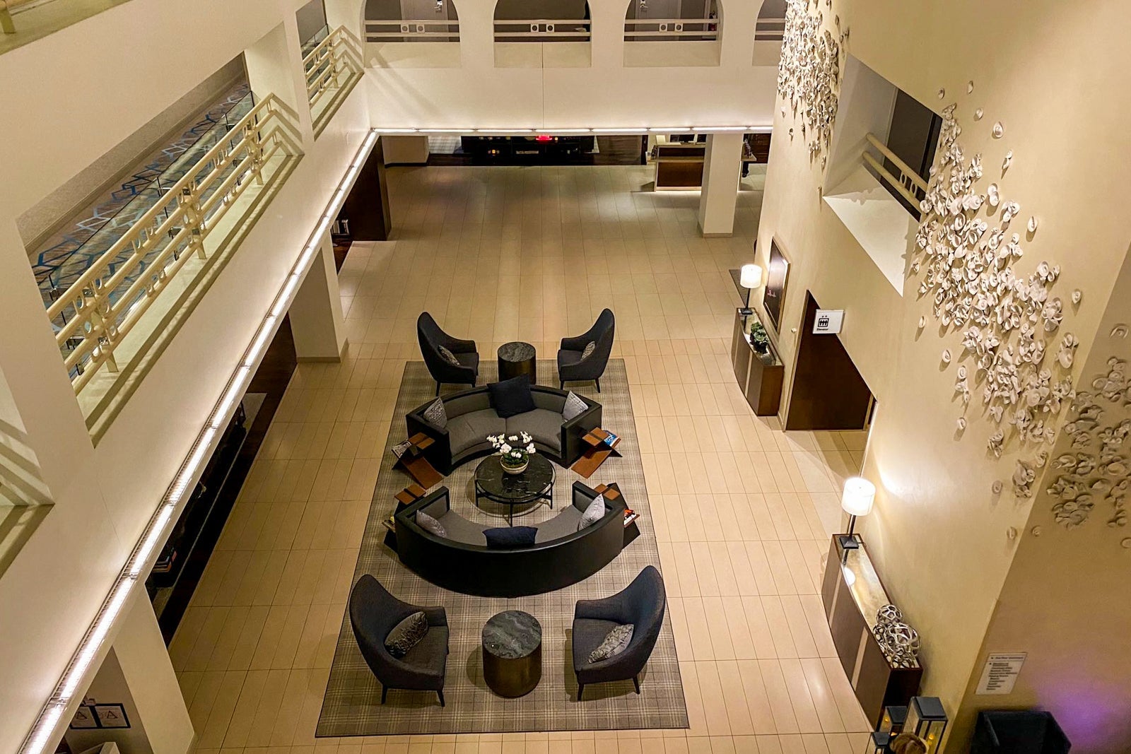 The lobby of the Boston Marriott Long Wharf is not huge but offers multiple lounges spread throughout the floor in separate rooms. Visitors populated the more comfortable and private seating areas.