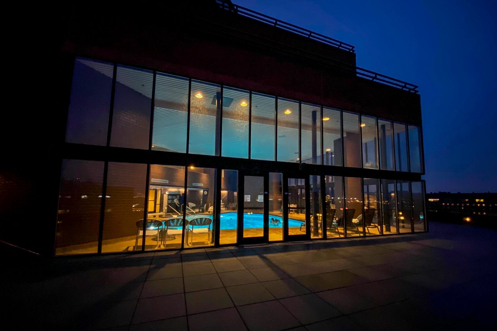 On the third floor, there was a fully equipped gym, pool and balcony overlooking the harbor.