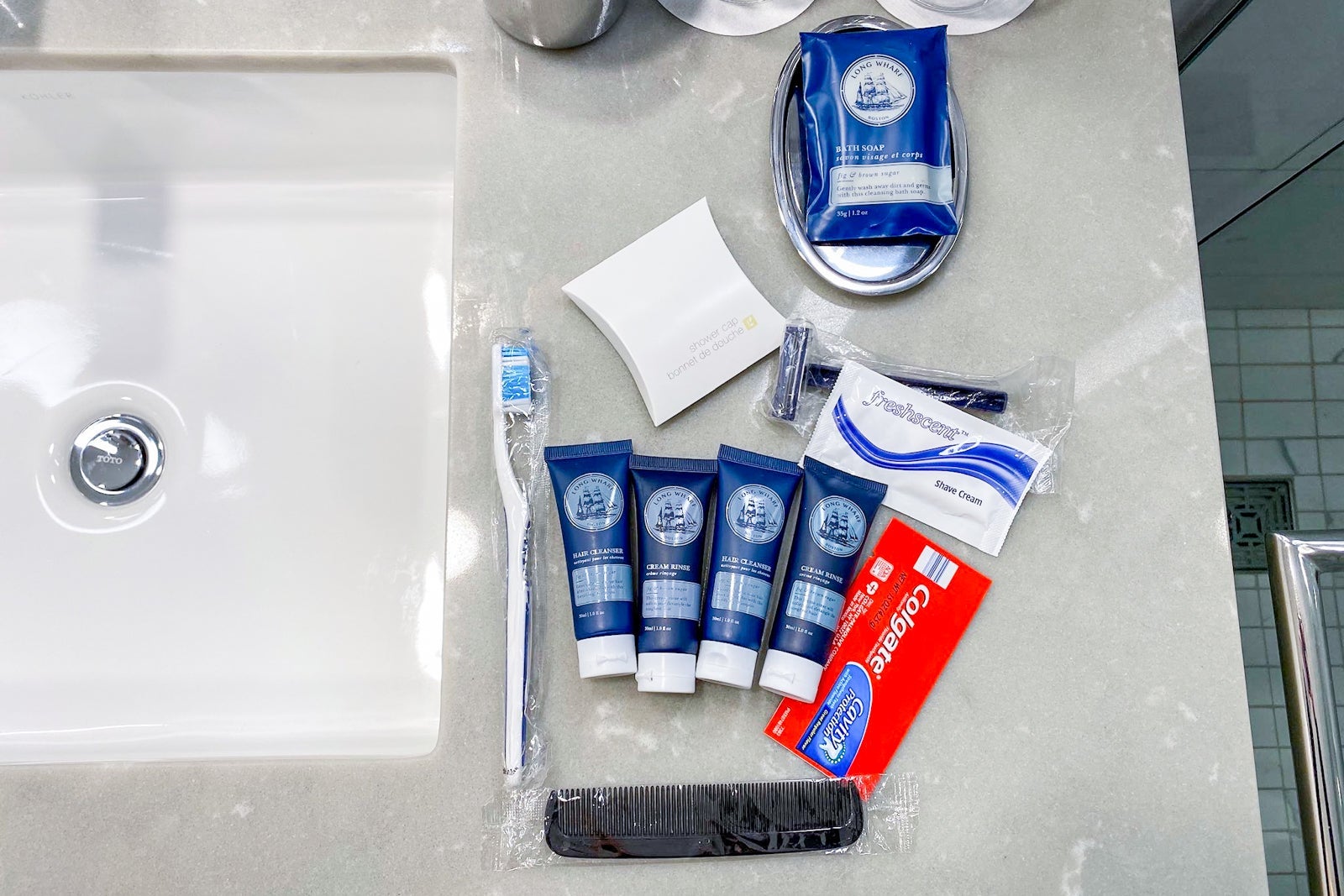 Inside the bag were a toothbrush, toothpaste, a razor, shaving cream, two shampoos, conditioner, body wash and a shower cap and a comb. There was also a shampoo, conditioner and body wash already stocked in the shower.