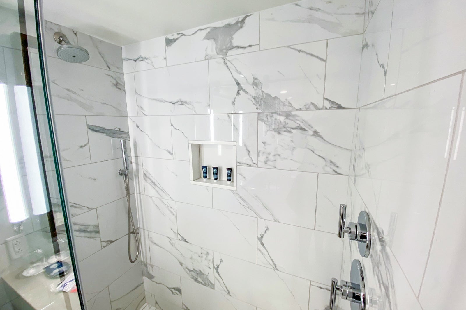 The shower was a good size and features two different shower heads, one wall-mounted and another handheld. The water pressure was decent, but nothing spectacular. What I liked about this shower was that the handles were on the opposite side of the showerheads, which meant I didn't have to worry about getting wet while turning on the shower.