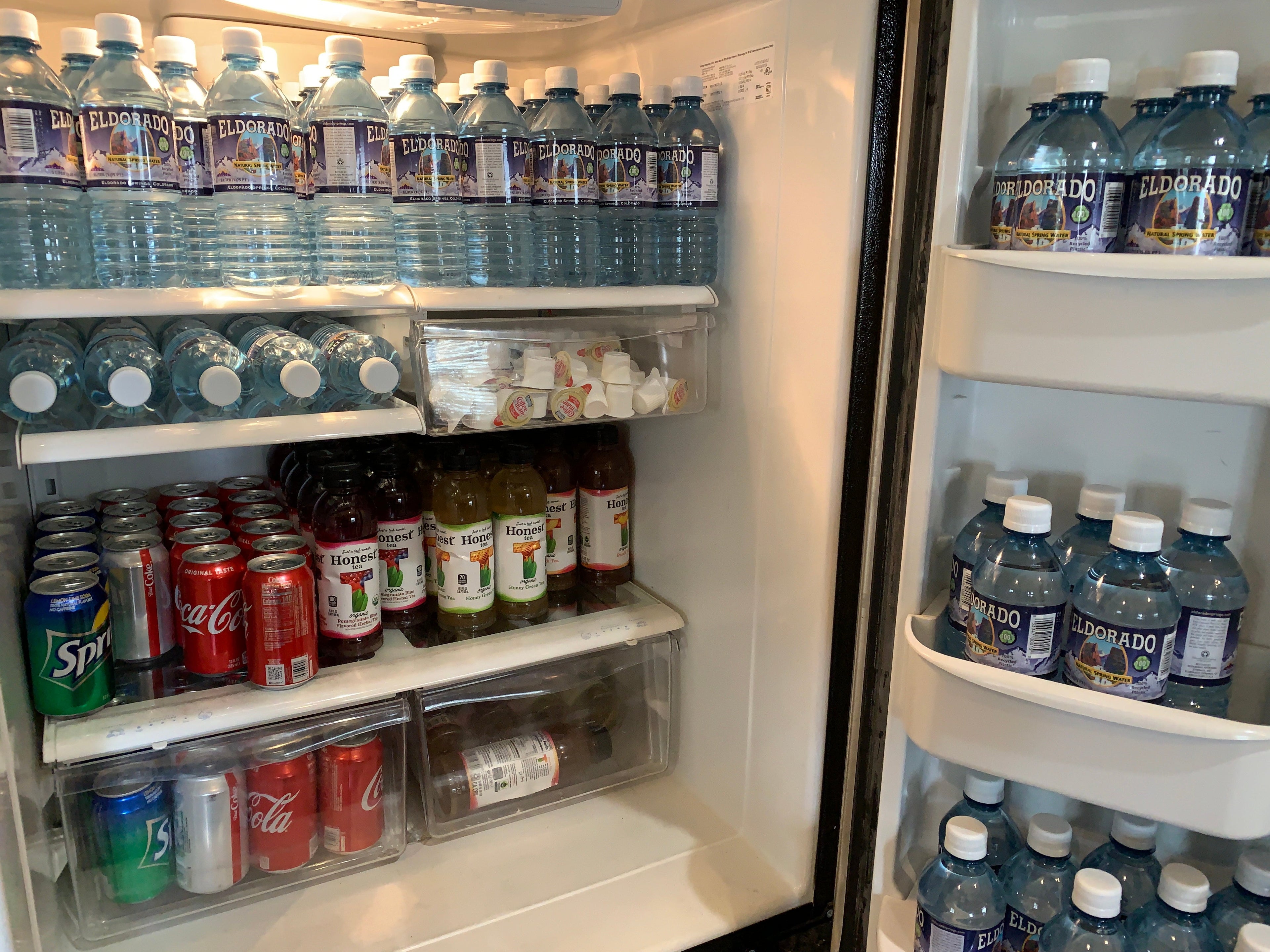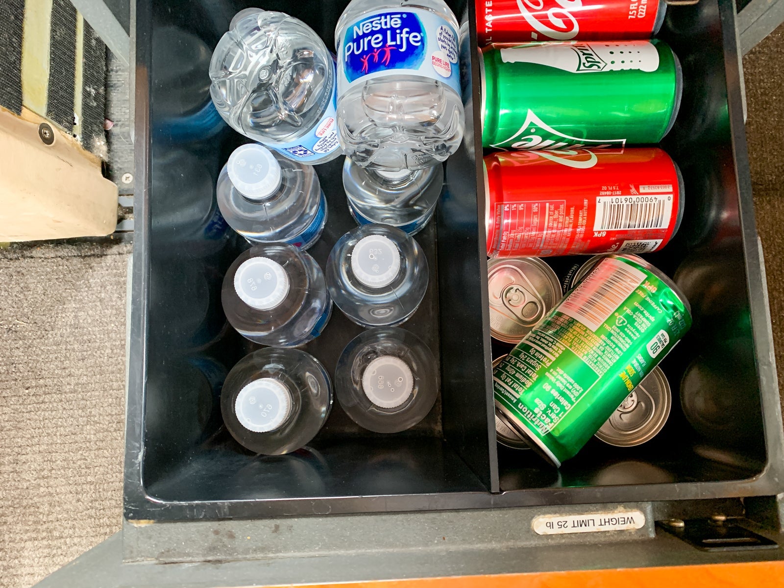 There was a small stash of soft drinks, water and peanuts available at no additional charge in the drawers just behind the lavatory.