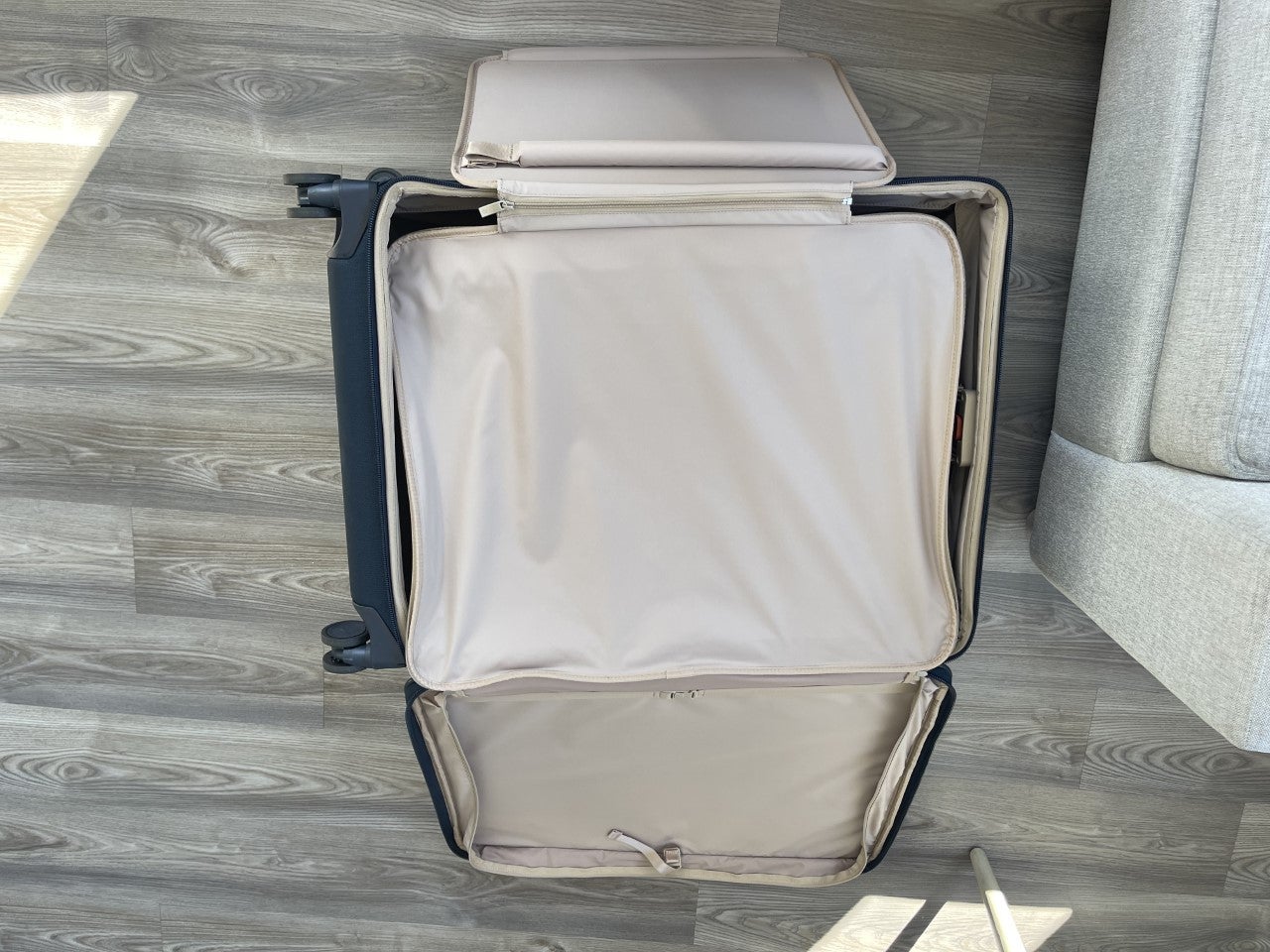 Inside the main compartment, there's a mesh garment strap to help stabilize your clothes. Given the size of the interior, if you don't fill the suitcase, you'll want to use this to prevent your clothes from moving around too much.