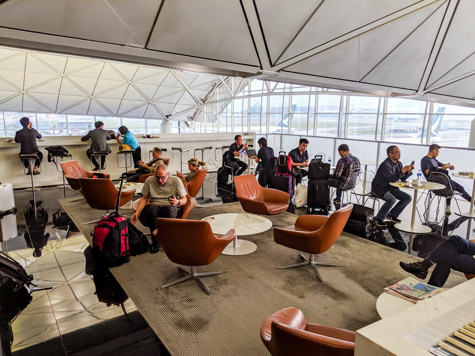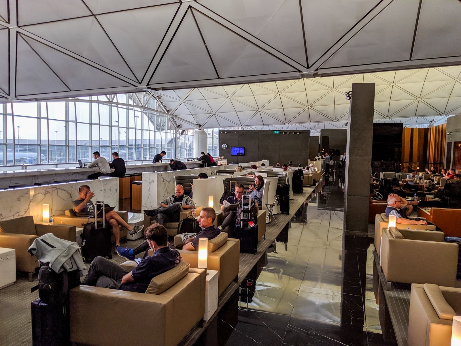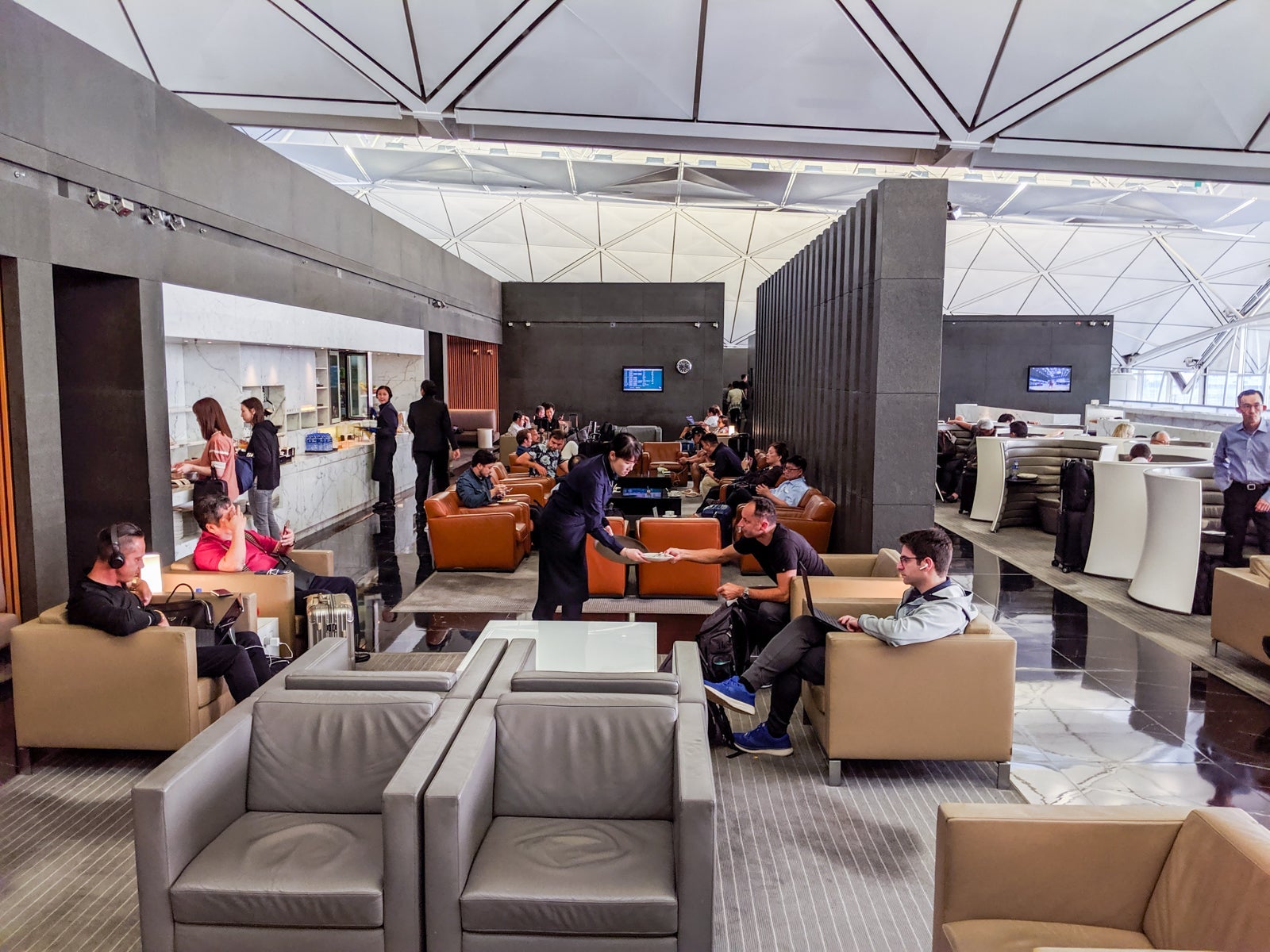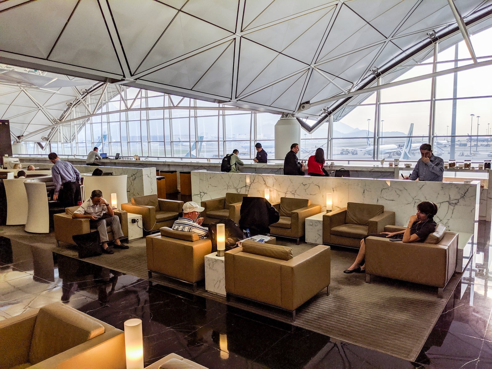 Up the stairs, business-class passengers turned left, while first-class ones turned right to the first-class-only area. In the business-class zone, a large, open seating area accompanied the primary food buffet opposite the sleek full-service bar, offering sweeping views HKG's southern half, including Lantau Island and departures from Runway 25L. It was relatively busy but still felt extremely peaceful and relaxed.