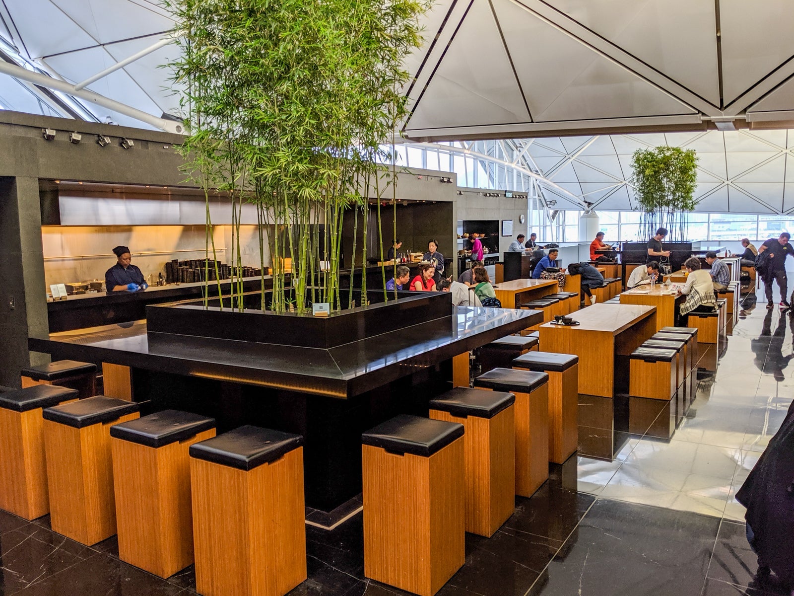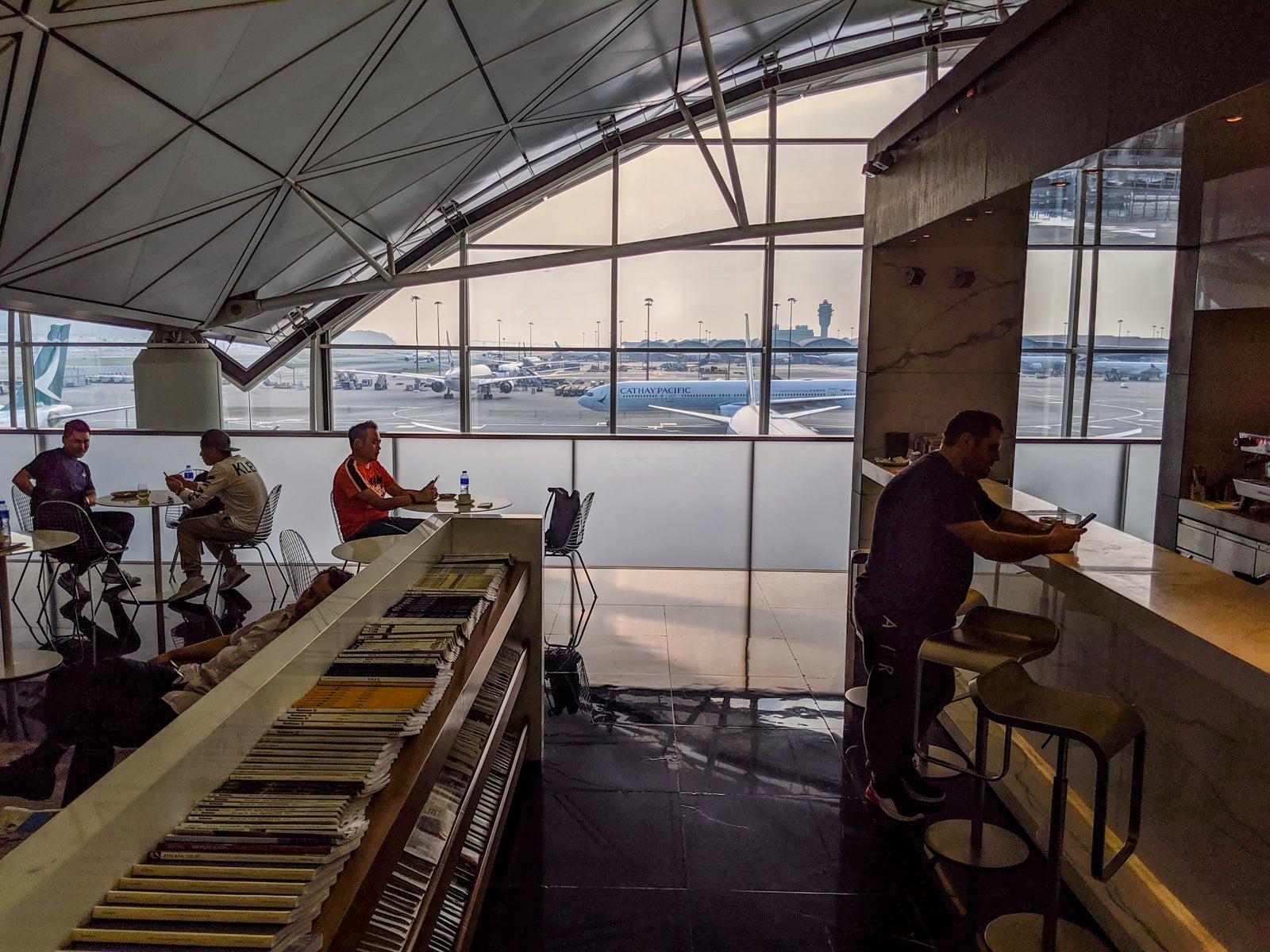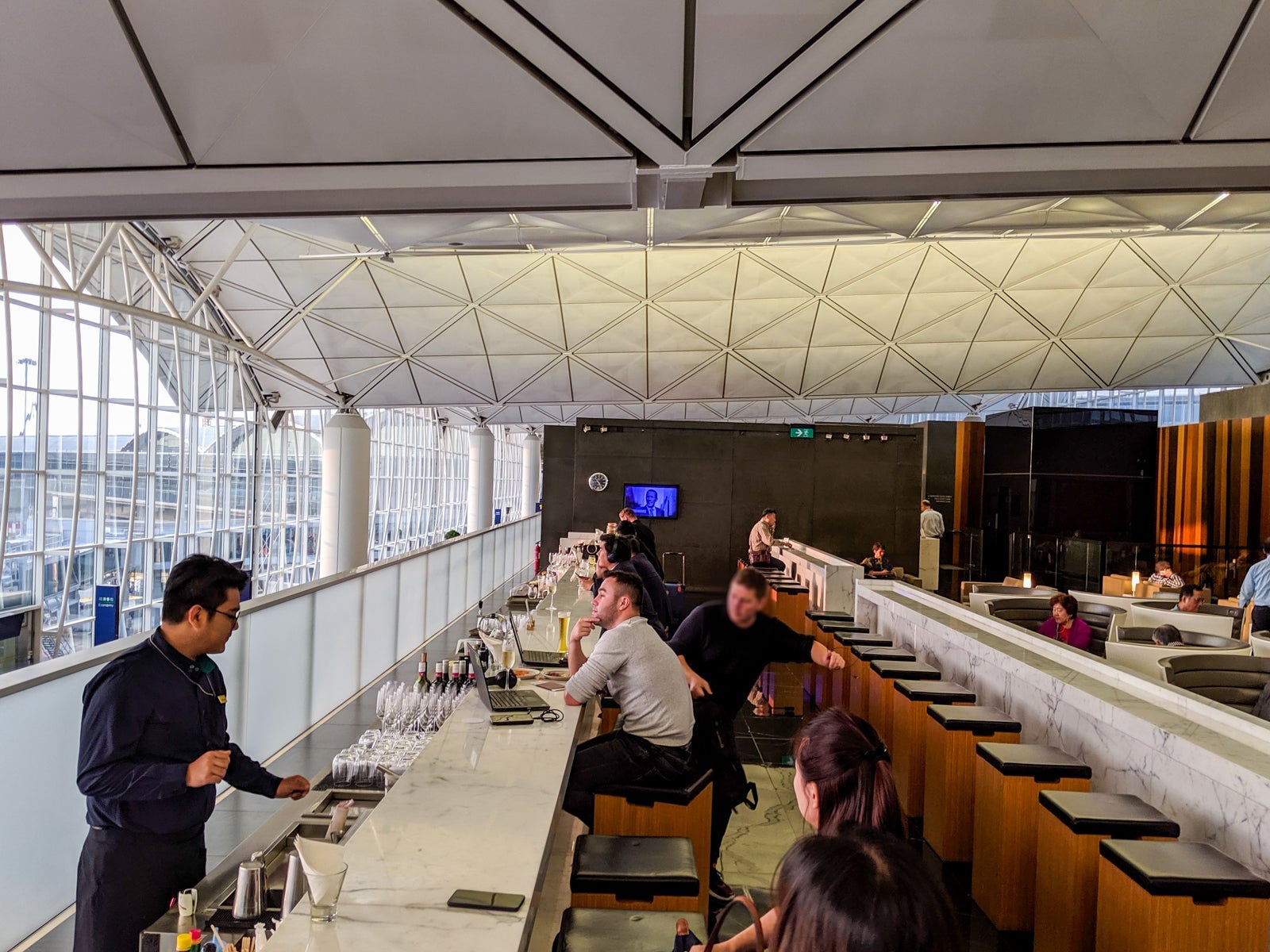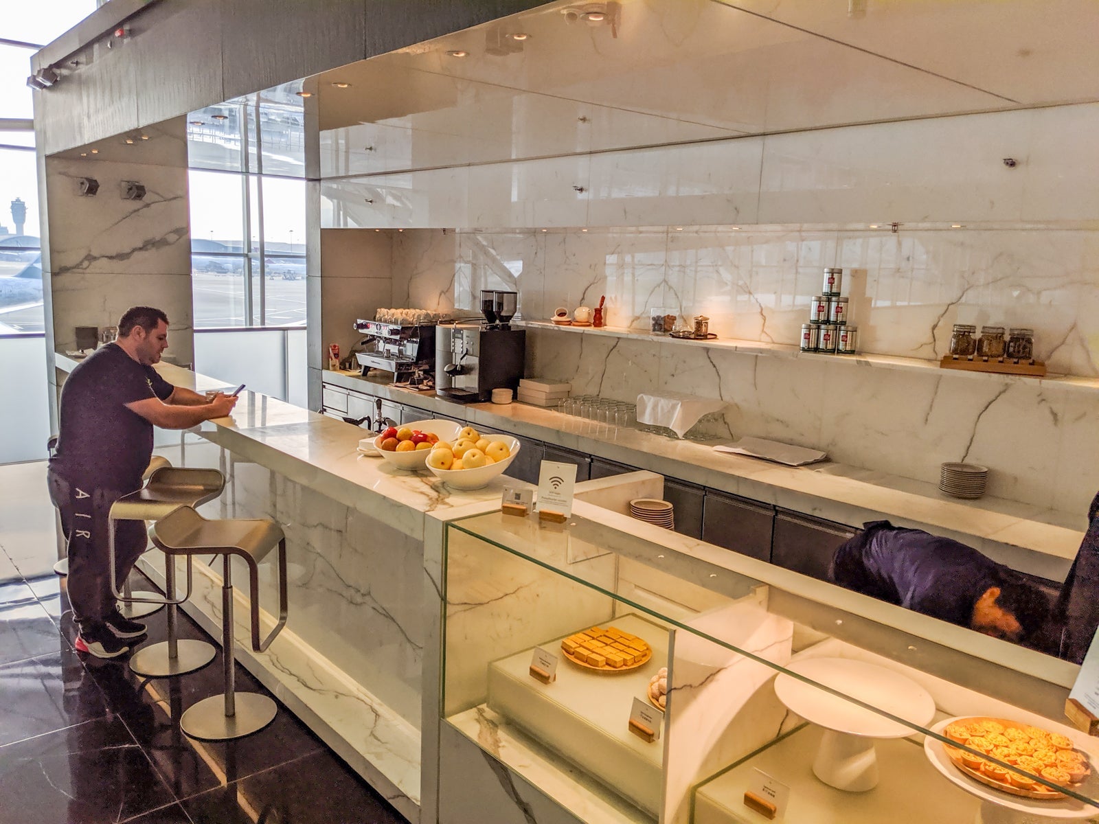 Up the stairs, business-class passengers turned left, while first-class ones turned right to the first-class-only area. In the business-class zone, a large, open seating area accompanied the primary food buffet opposite the sleek full-service bar, offering sweeping views HKG's southern half, including Lantau Island and departures from Runway 25L. It was relatively busy but still felt extremely peaceful and relaxed.