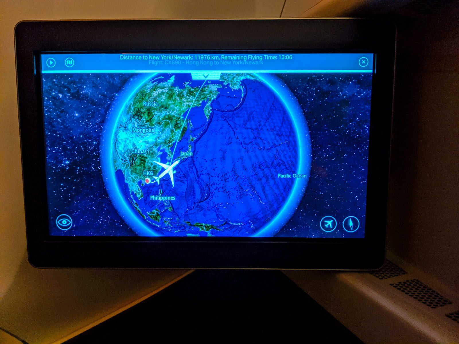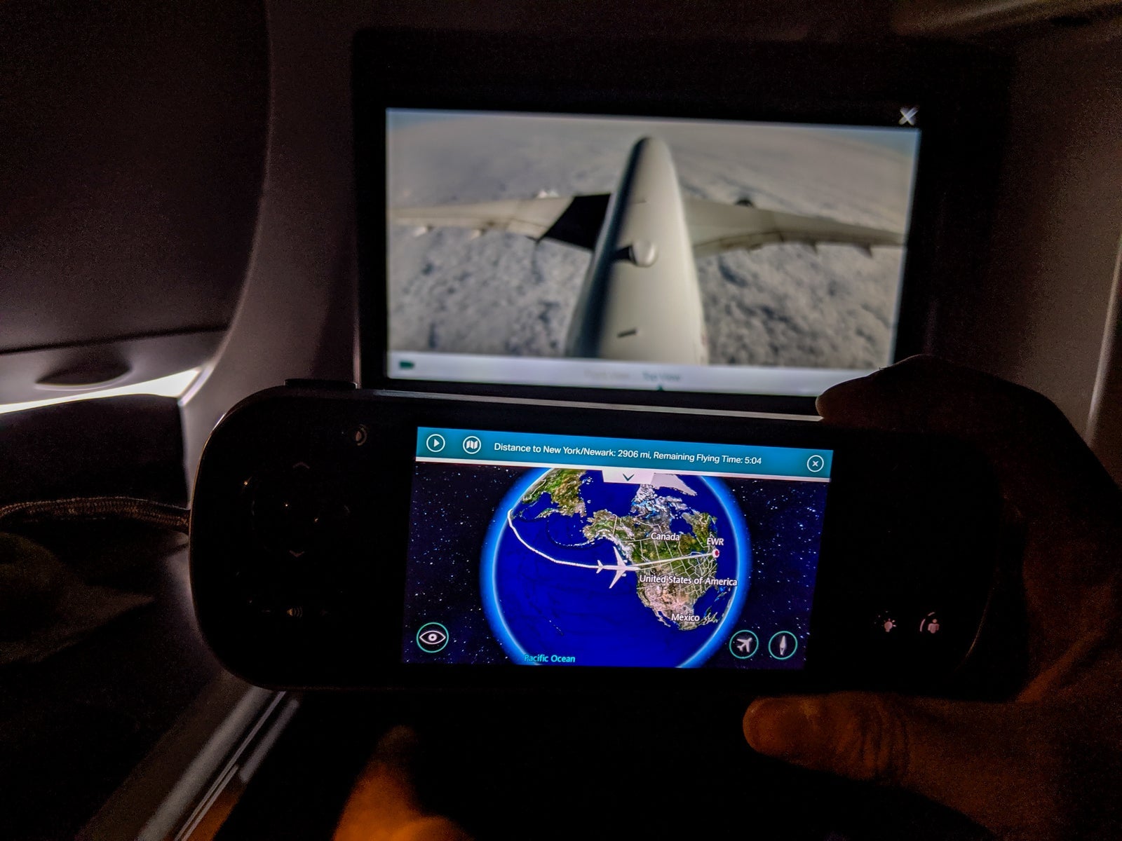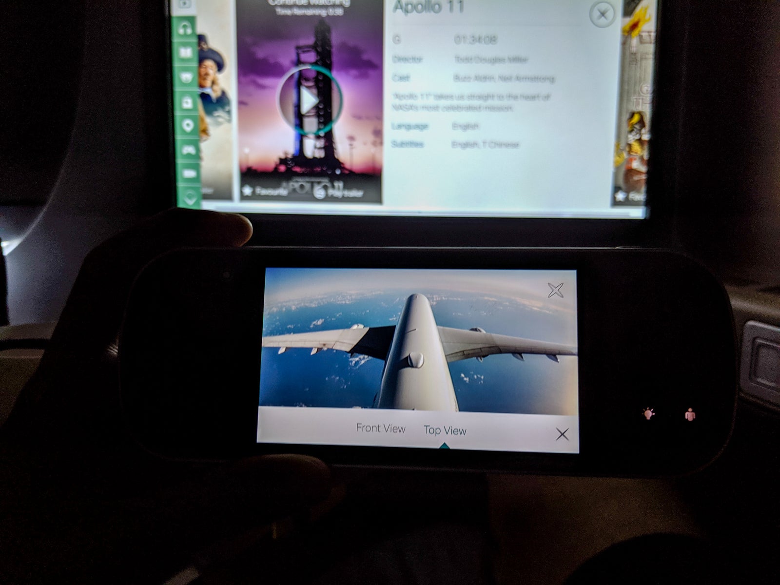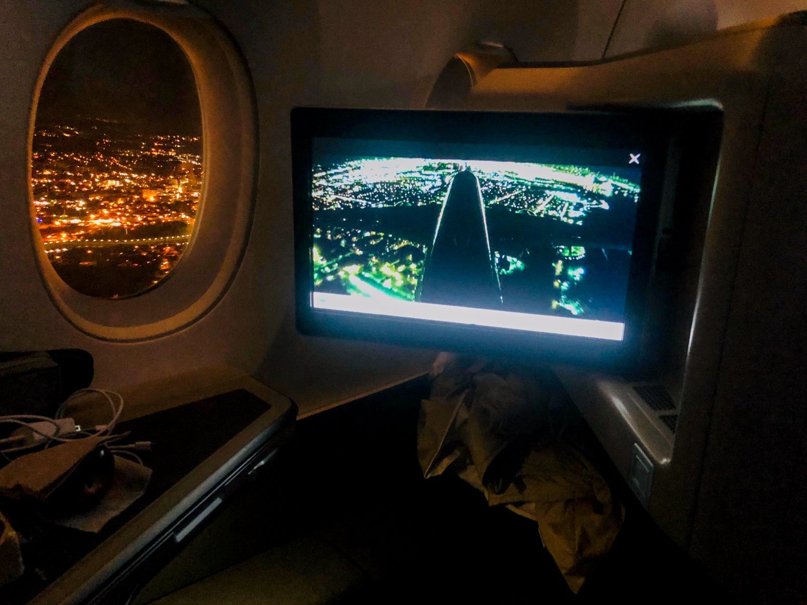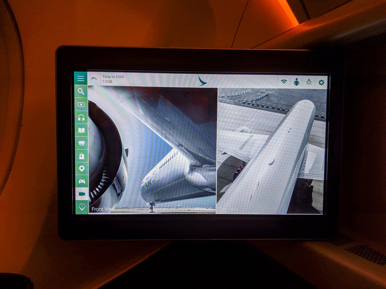 I wished it were more customizable, especially with the remote, but I'm nitpicking. Nevertheless, the map modes made using the live camera feed, with a camera on the tail and near the nose landing gear, even more fun. Indeed, the cameras were especially nice because cabin crew asked that passengers keep shades closed for almost the entire flight as people slept.