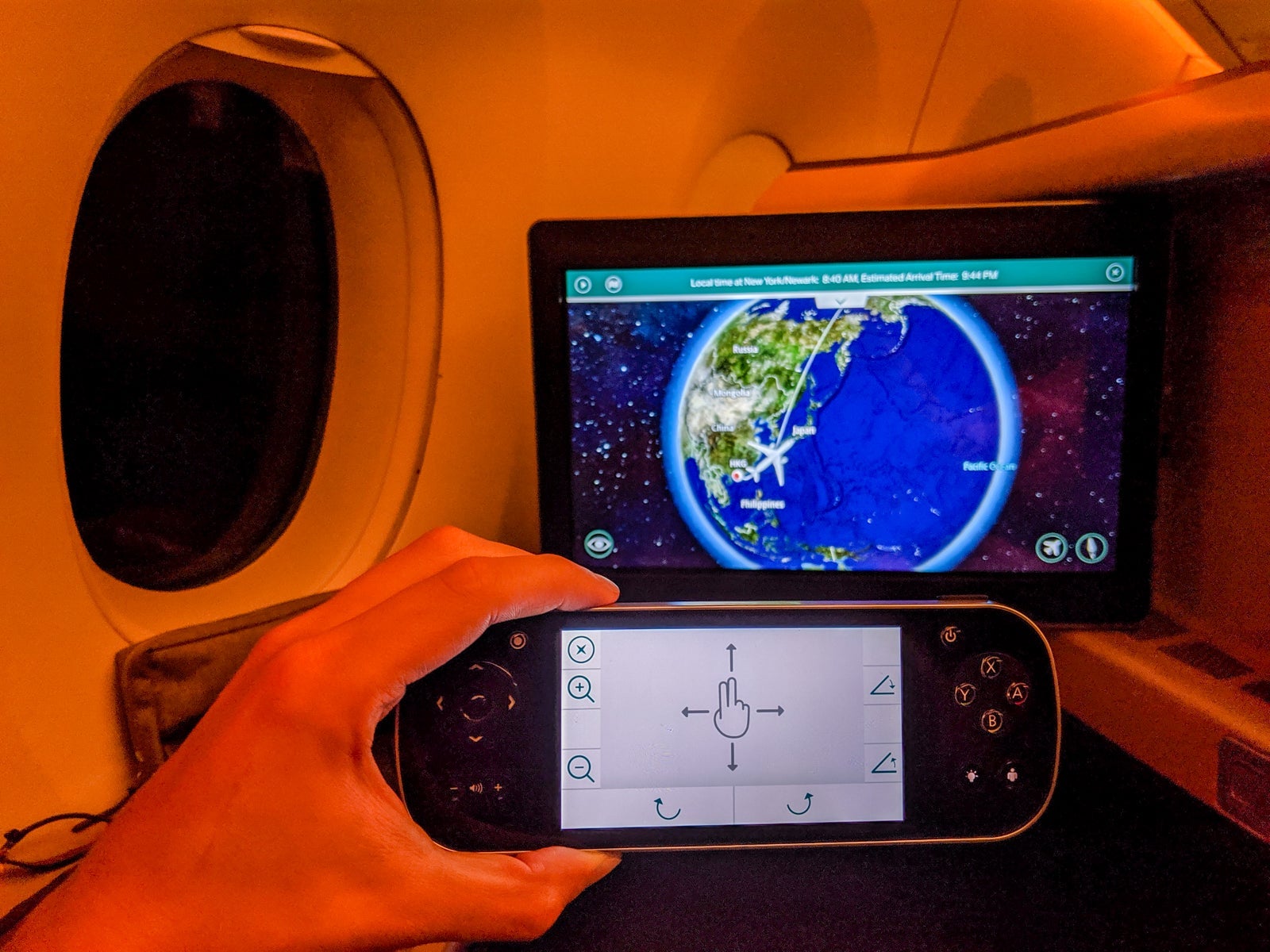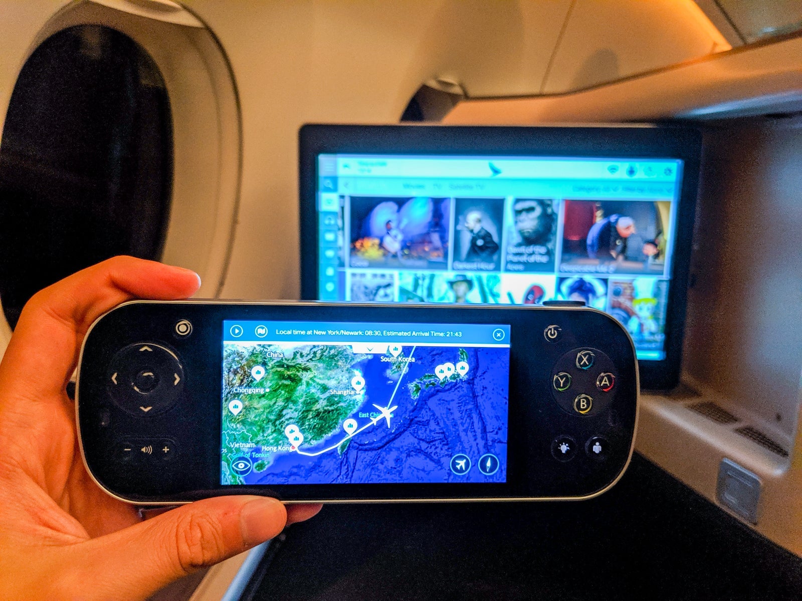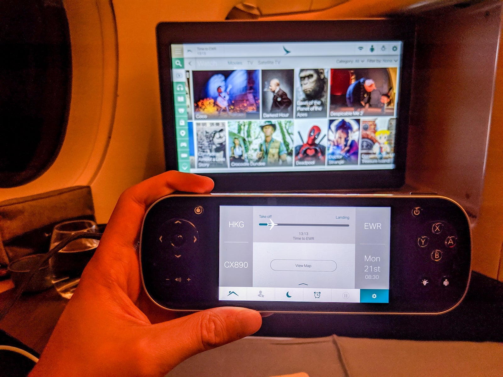 Though the screen could be controlled via touch, Cathay offered a digital remote that let you control the main screen without leaning forward and provided easy browsing to all of the IFE content while you watched on the main screen. It was actually quite convenient and made multitasking easy.