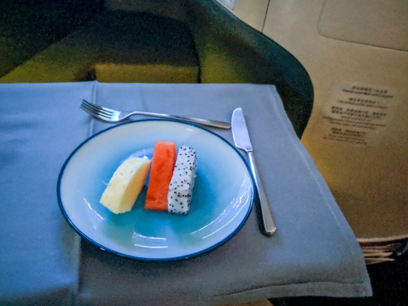 Lastly, cabin crew came around offering three types of Godiva chocolate: I went with a raspberry one. It was expectedly tasty. Still craving more fruit, I asked for the fruit plate, which was delivered shortly after.
