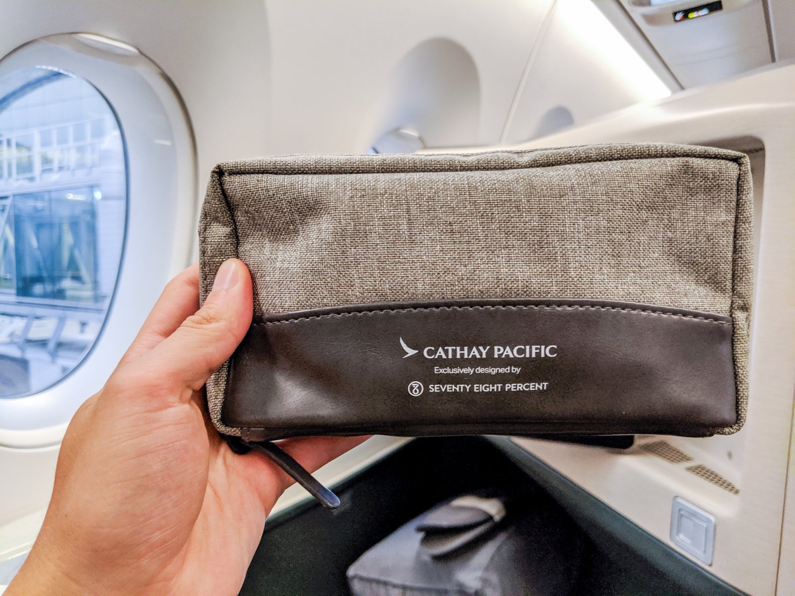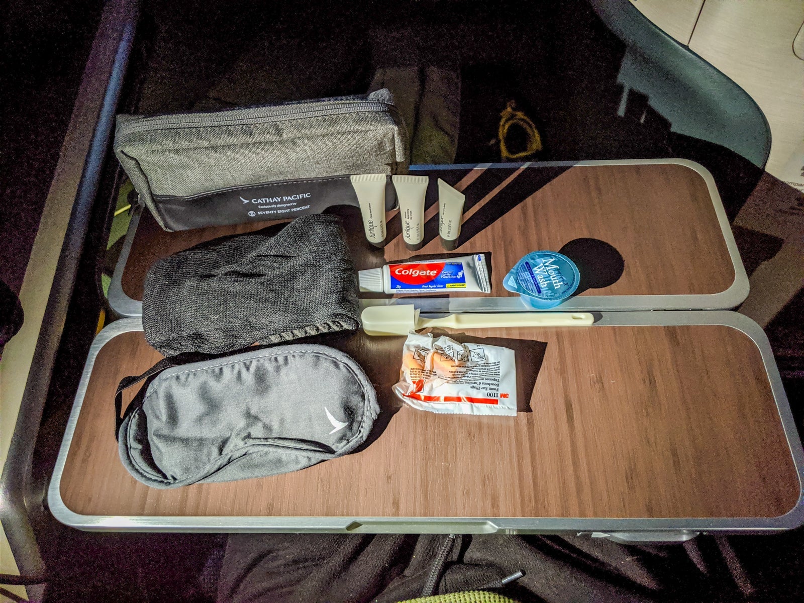 Inside the cubby, I found Cathay's latest business-class amenity kit and complimentary over-ear headphones. Simple and modern on the outside, the amenity kit offered the usual stuff inside: socks, eye mask, earplugs, Jurlique hand lotion/cream, toothbrush, toothpaste and mouthwash.