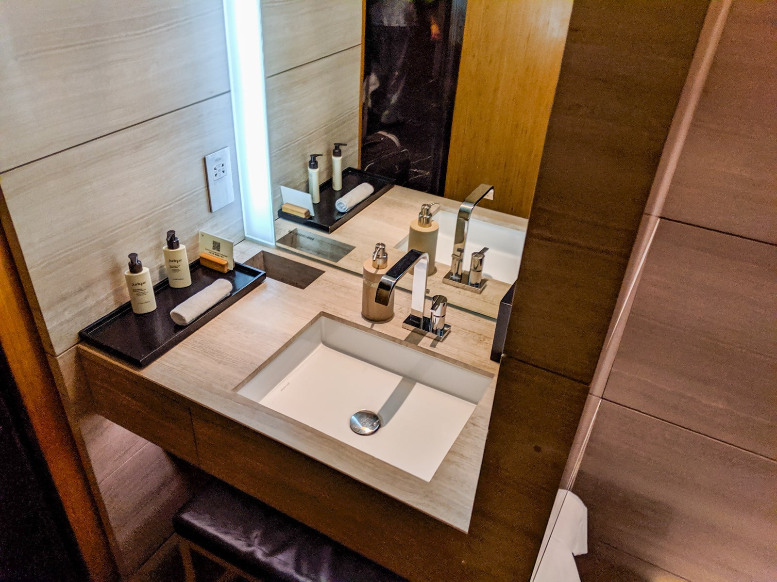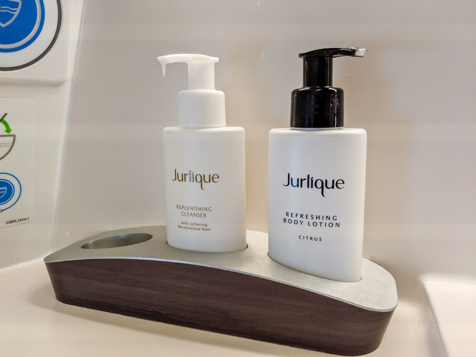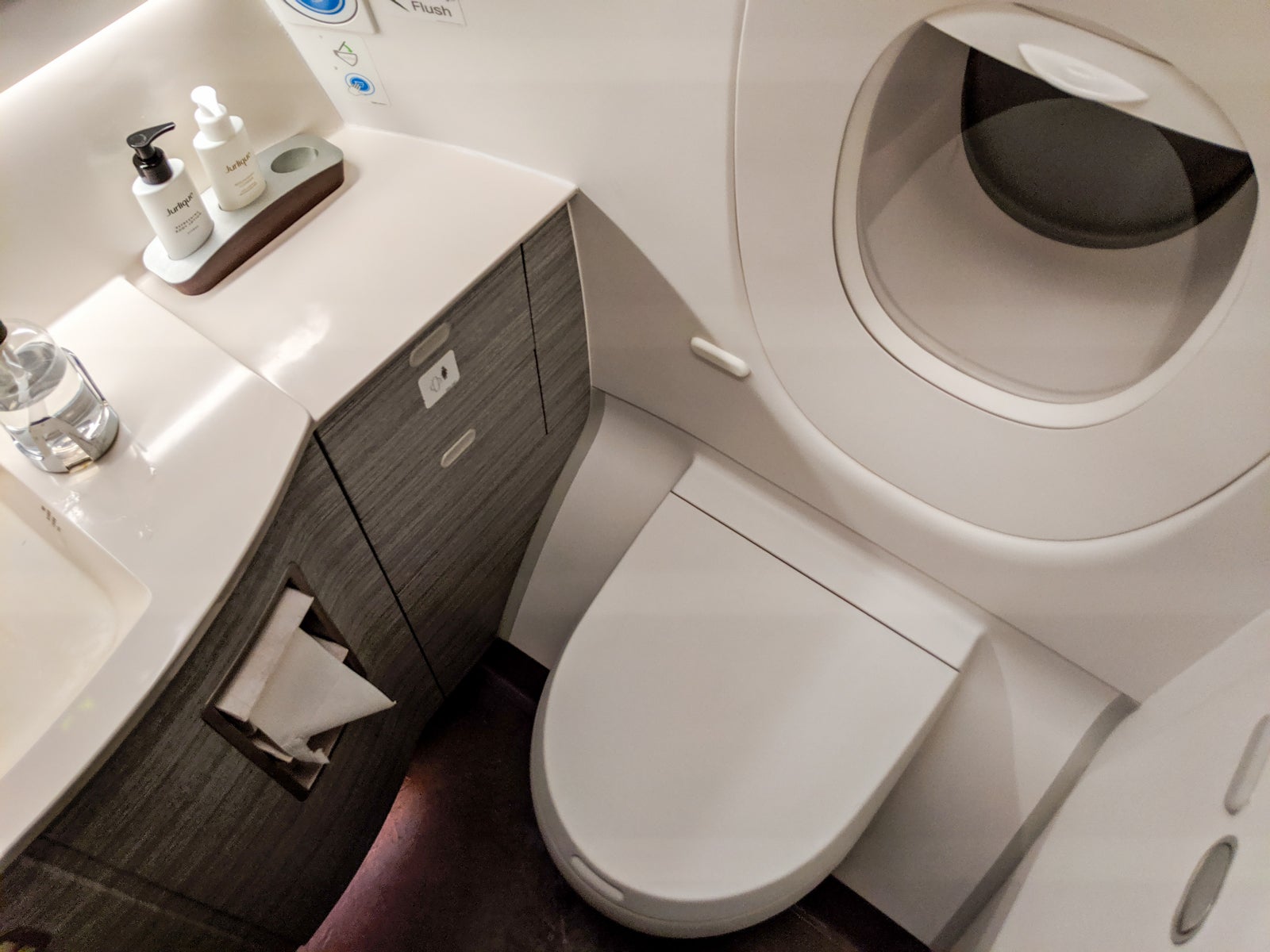 Lavatories on these planes were a treat. There were three business-class lavatories, two in the front by the cockpit, and one in the galley between the two business-class cabins. They were stocked with Jurlique soap and body lotion, and two of the three even featured windows!
